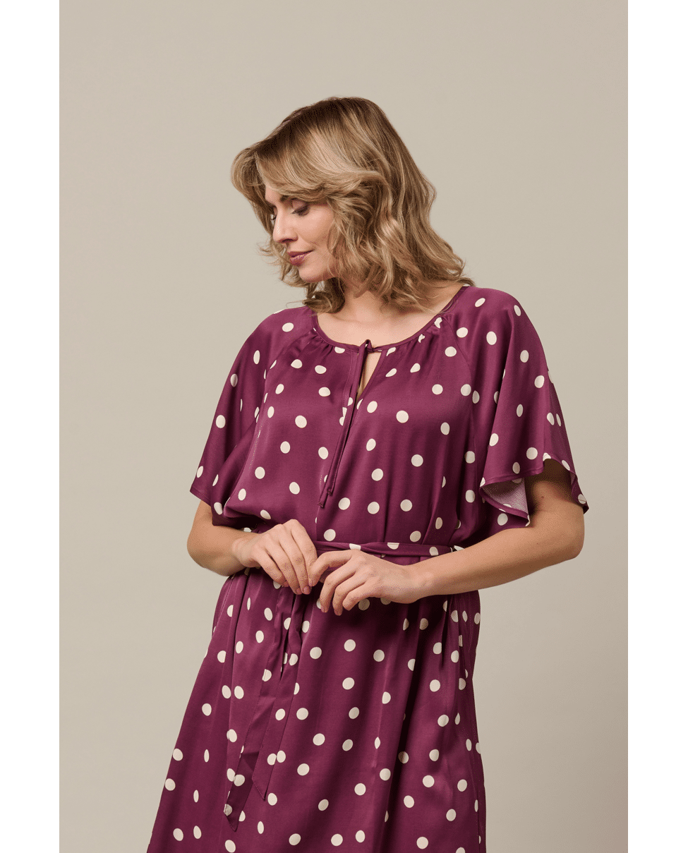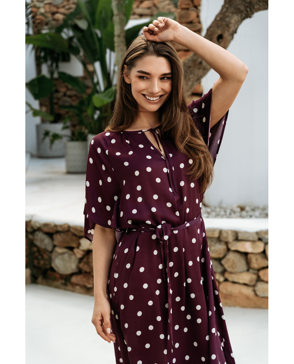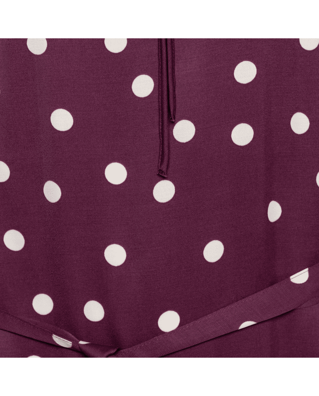 De combinatie van de zachte plumkleur met de stippenprint en het strikceintuur zorgt voor een moeiteloos stijlvolle outfit die je zo aantrekt.
