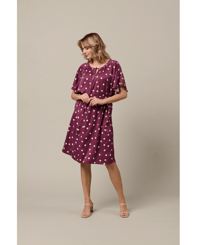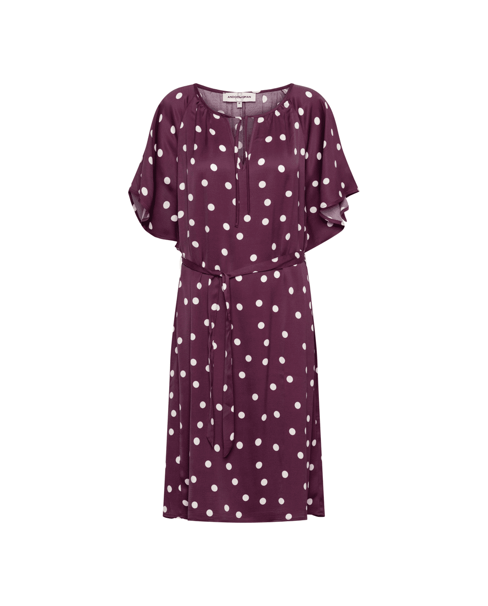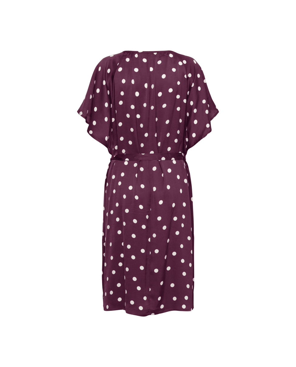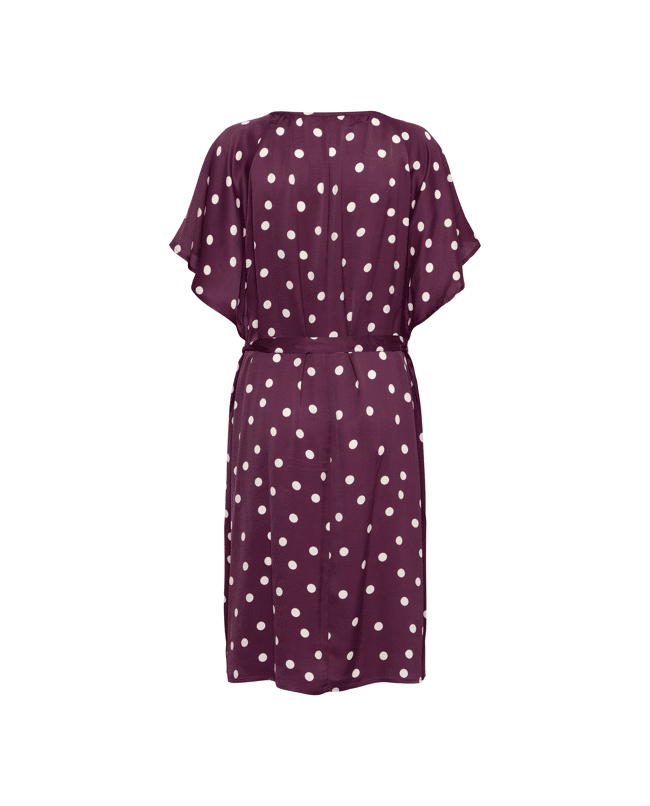 De combinatie van de zachte plumkleur met de stippenprint en het strikceintuur zorgt voor een moeiteloos stijlvolle outfit die je zo aantrekt.
