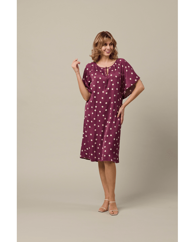 Deze midi jurk met stippenprint is een fijne keuze voor zomerse dagen of een casual etentje. De luchtige stof en losse mouwen geven je een comfortabele, vrouwelijke look met een speelse twist.