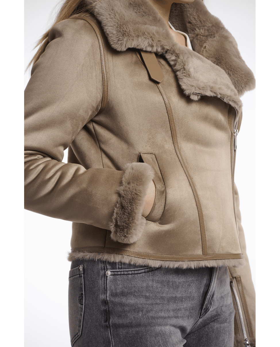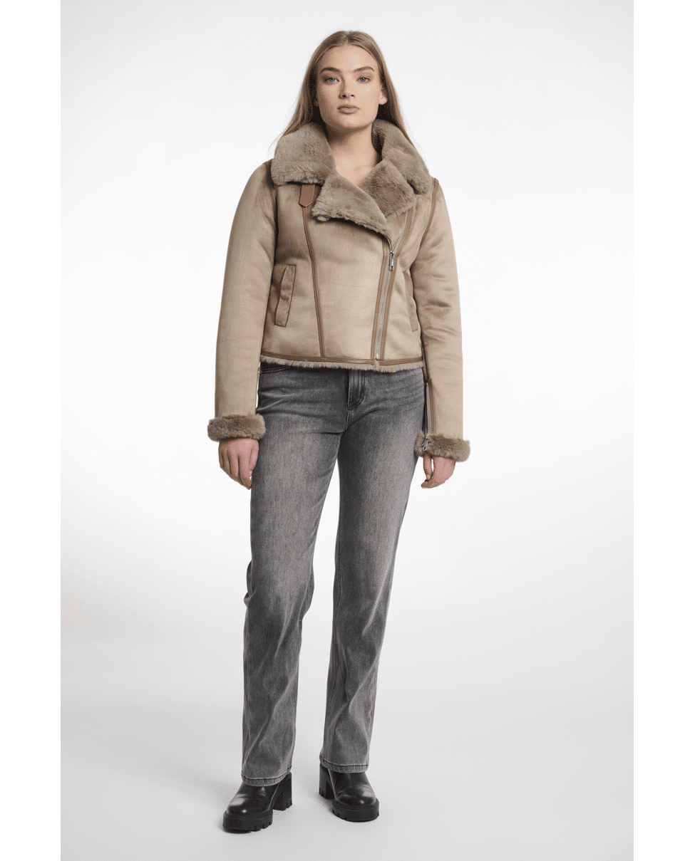 Dit stoere jasje combineert het edgy karakter van een biker met het comfort van zacht imitatiebont. Perfect voor frisse dagen met flair.