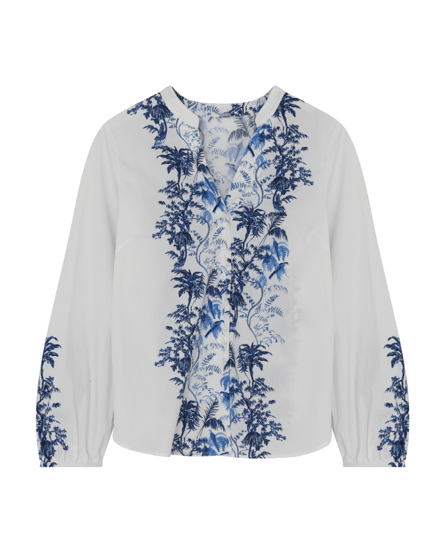 De Bayanna blouse heeft een witte basis met botanische print in blauwtonen. Dankzij de V-hals, knoopsluiting en elastiek in de mouwen is het een luchtig en vrouwelijk item voor elk seizoen.