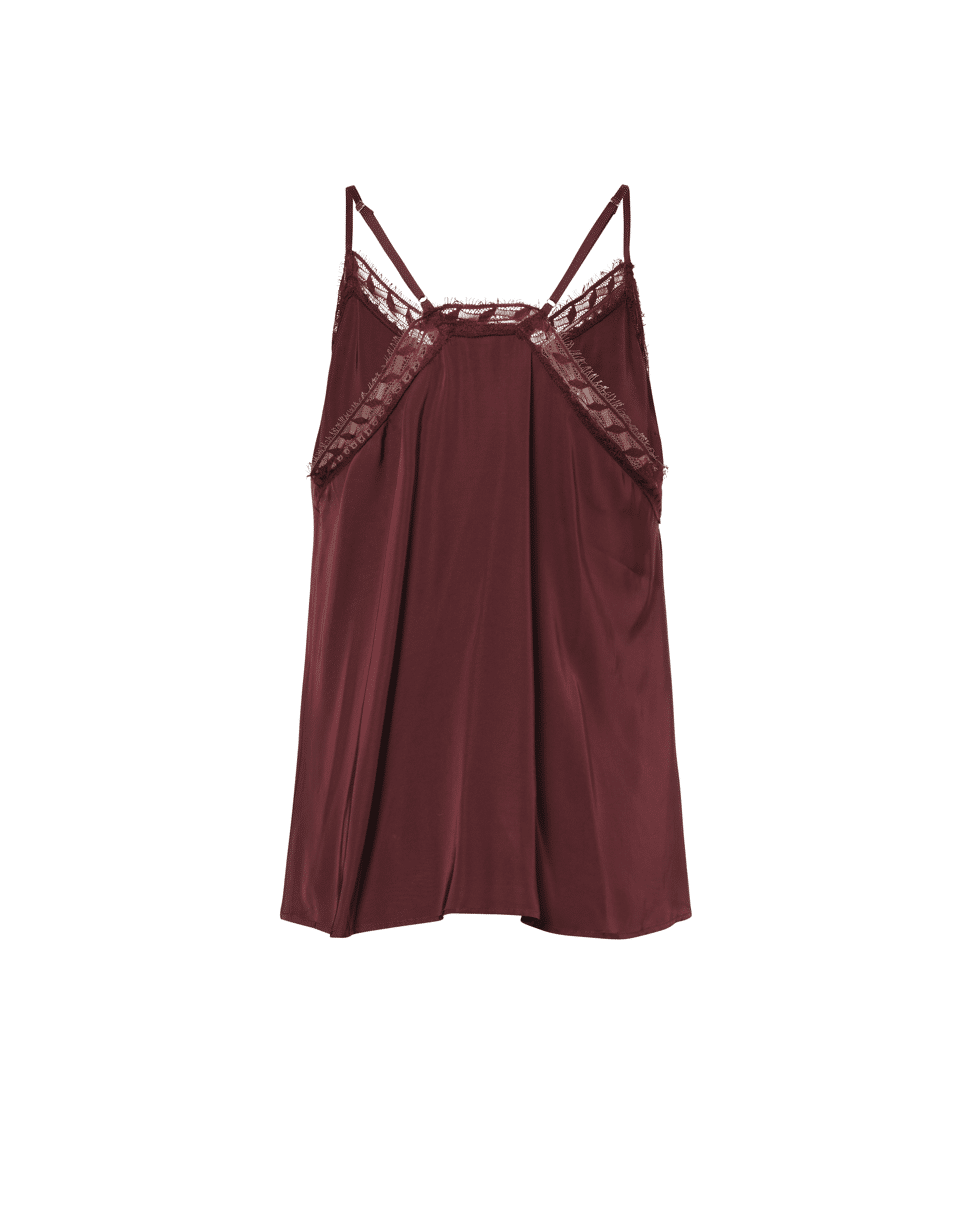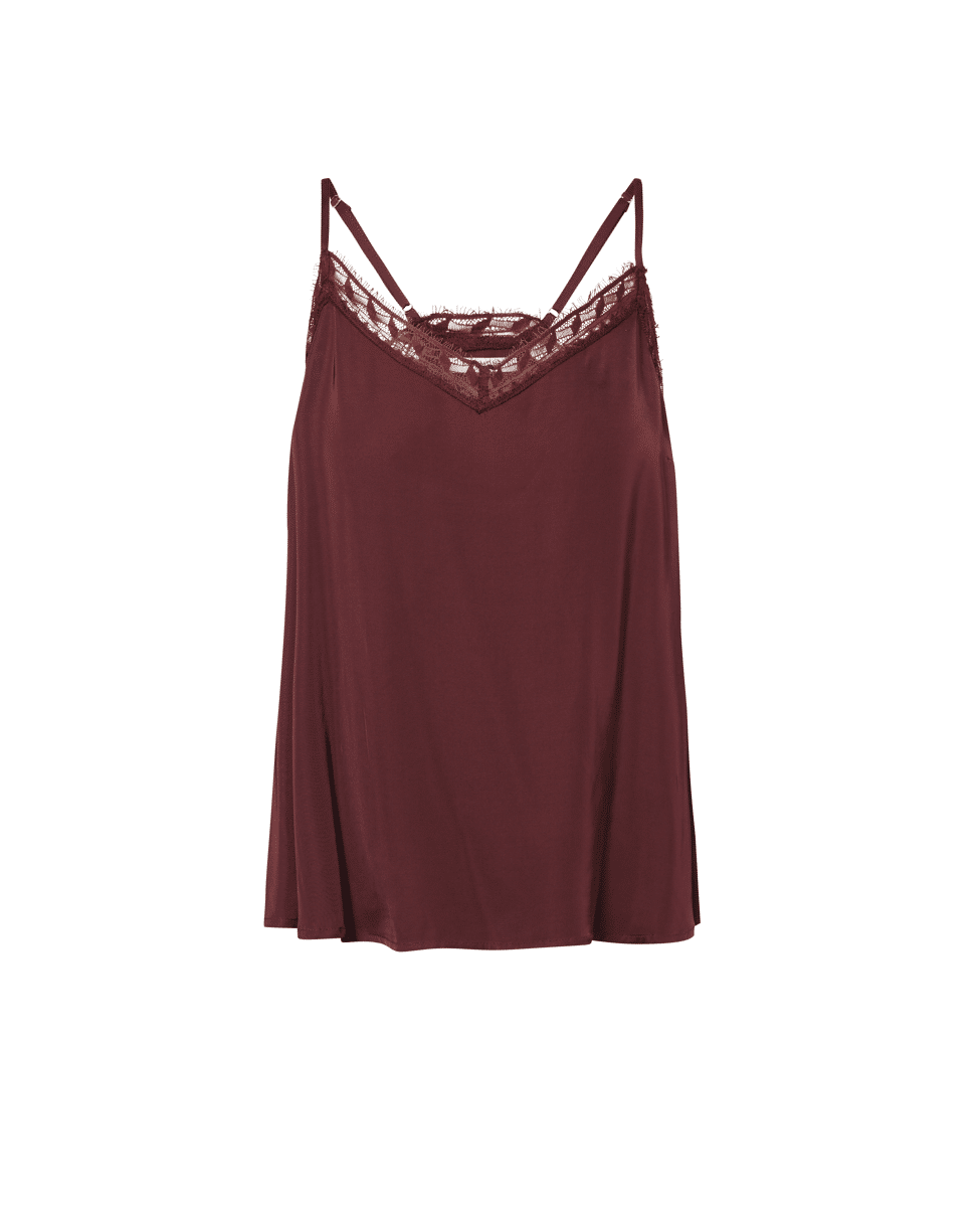 De V-hals met transparant kant maakt deze top subtiel verleidelijk. De soepelvallende stof voelt licht en luxe aan.