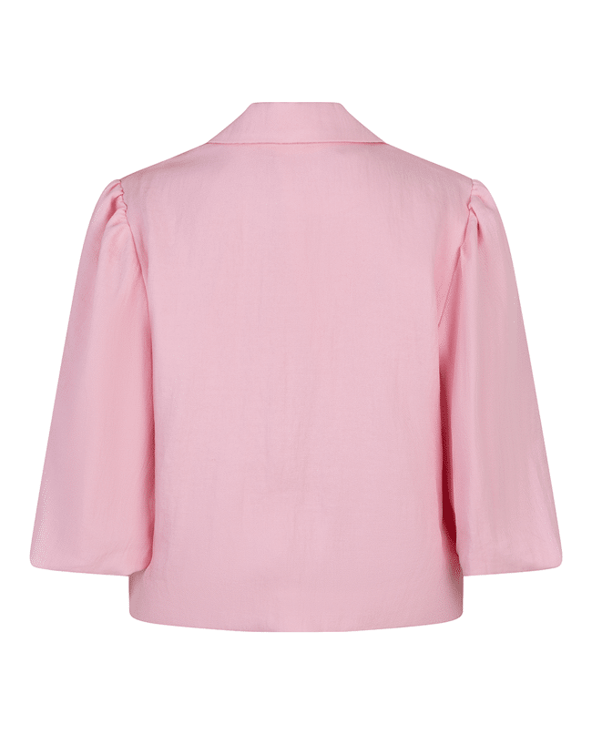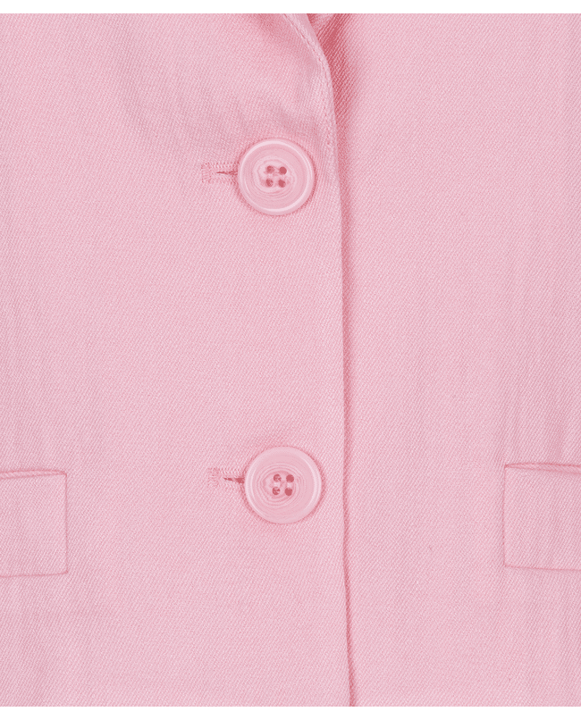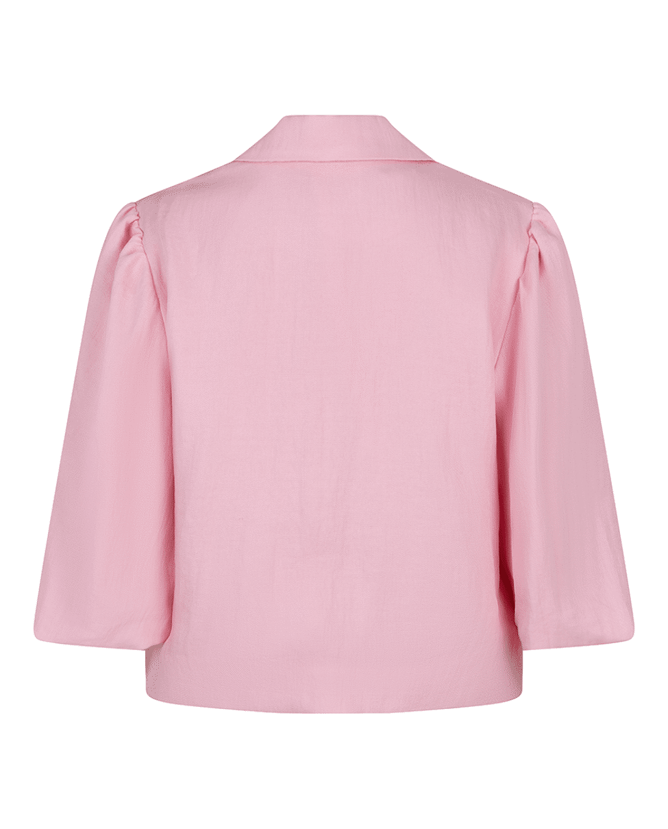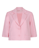 Een vrouwelijke cropped blazer in de zachte tint Romance Rose. De licht glanzende twillkwaliteit en de subtiele pofmouw geven dit jasje een elegante, moderne uitstraling.