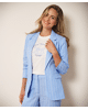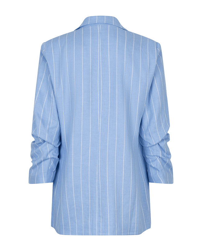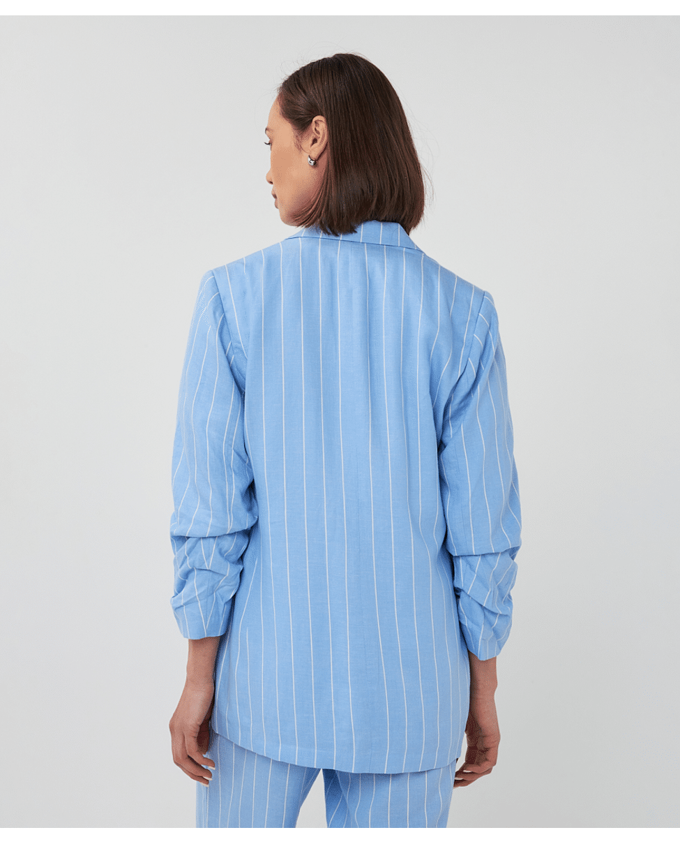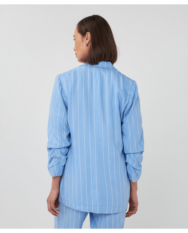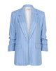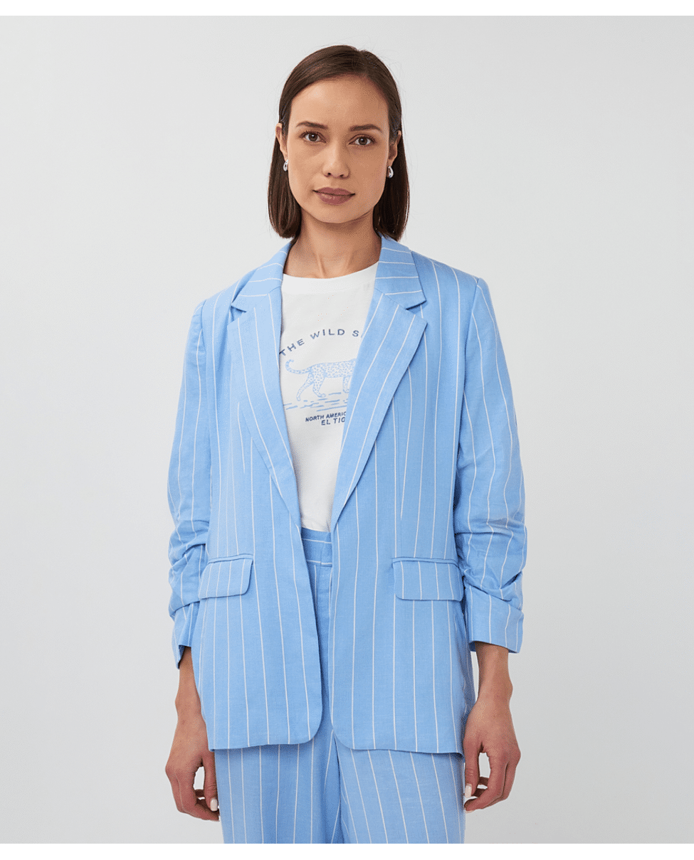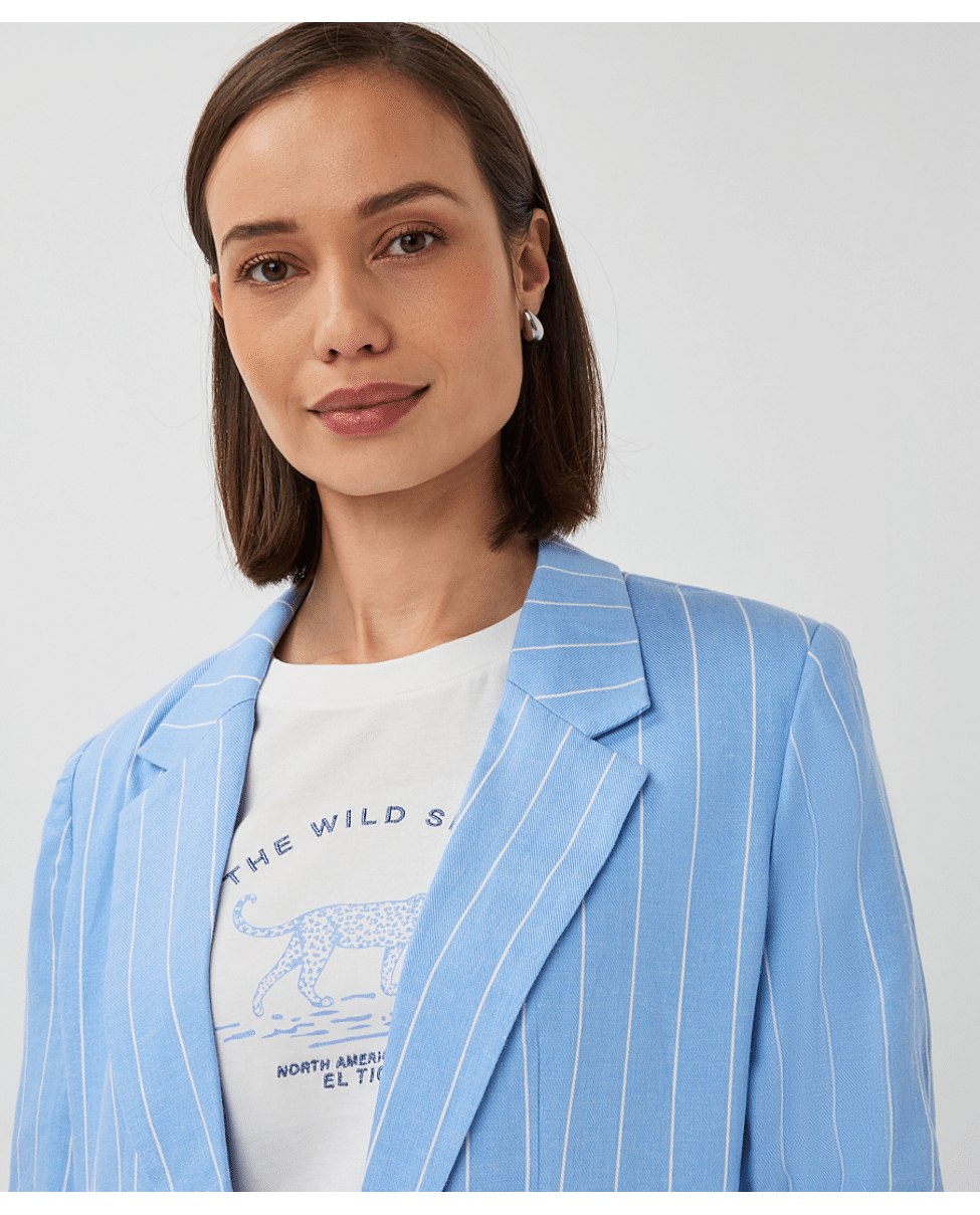 Linnen-blend blazer met subtiele streep in frisse Pacific Blue. Deze gevoerde blazer heeft een casual-elegante uitstraling en is perfect voor het voorjaar – combineer ‘m met denim of als set met de bijpassende broek.