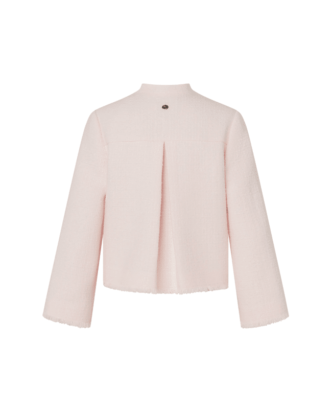 De ronde halslijn en de rafelrand geven deze blazer een moderne twist – stijlvol bij een jurk of als co-ord met een pantalon.