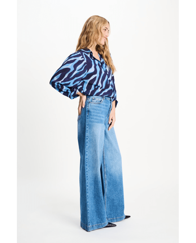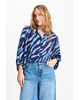 Deze blouse met abstract dierenpatroon in blauwtinten is perfect voor wie kleur en expressie wil toevoegen aan haar garderobe. Draag ‘m naar werk, een diner of gewoon omdat het kan.