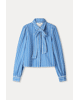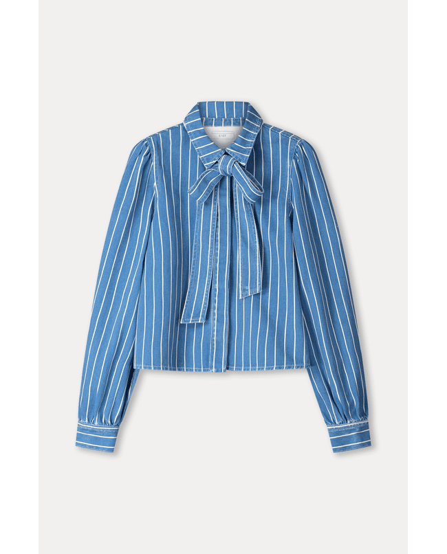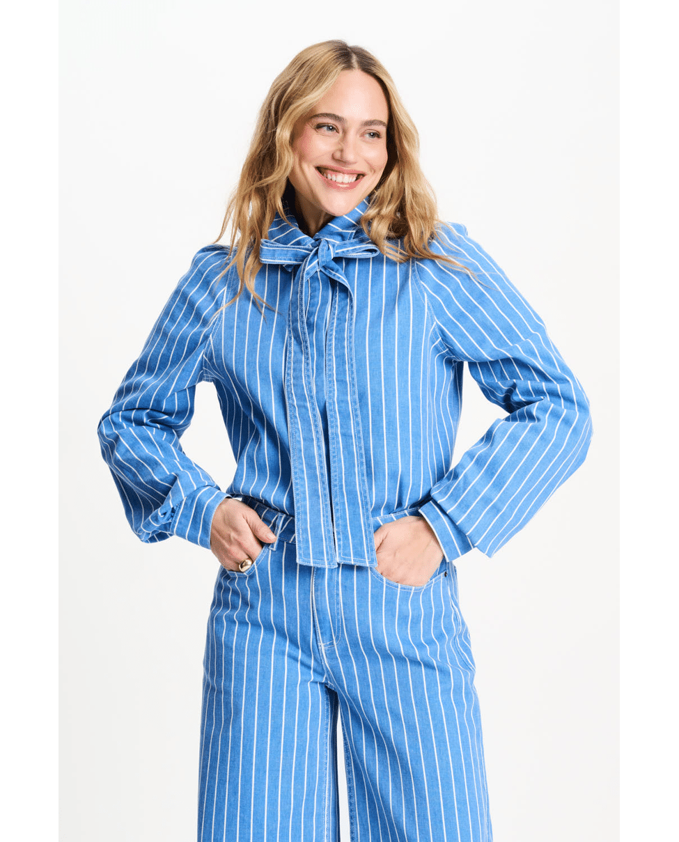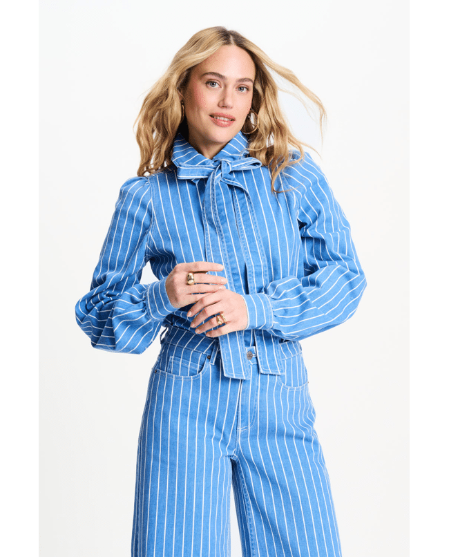 De combinatie van denim en het strikdetail geeft een subtiel retrogevoel, zonder oubollig te zijn. Stijlvol op een high waist broek of rok.