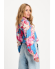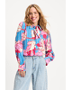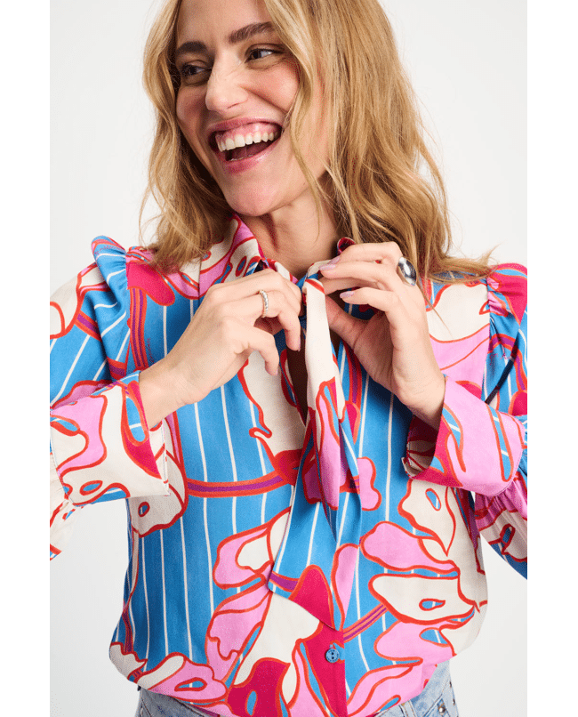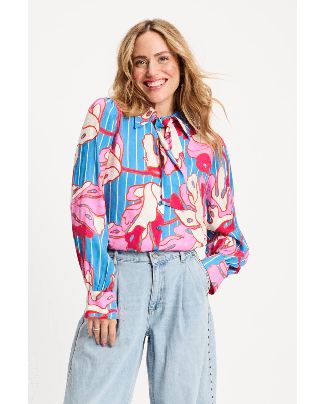 Blouse met blauwe strepen en roze-rode bloemenprint, voorzien van strikdetail bij de hals. Gemaakt van soepele, duurzame stof met een comfortabele regular fit.