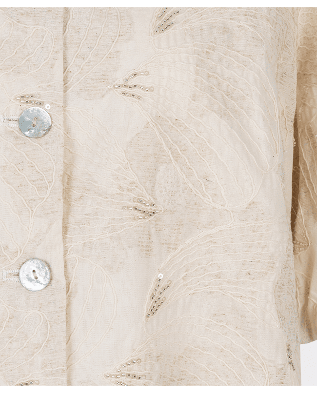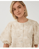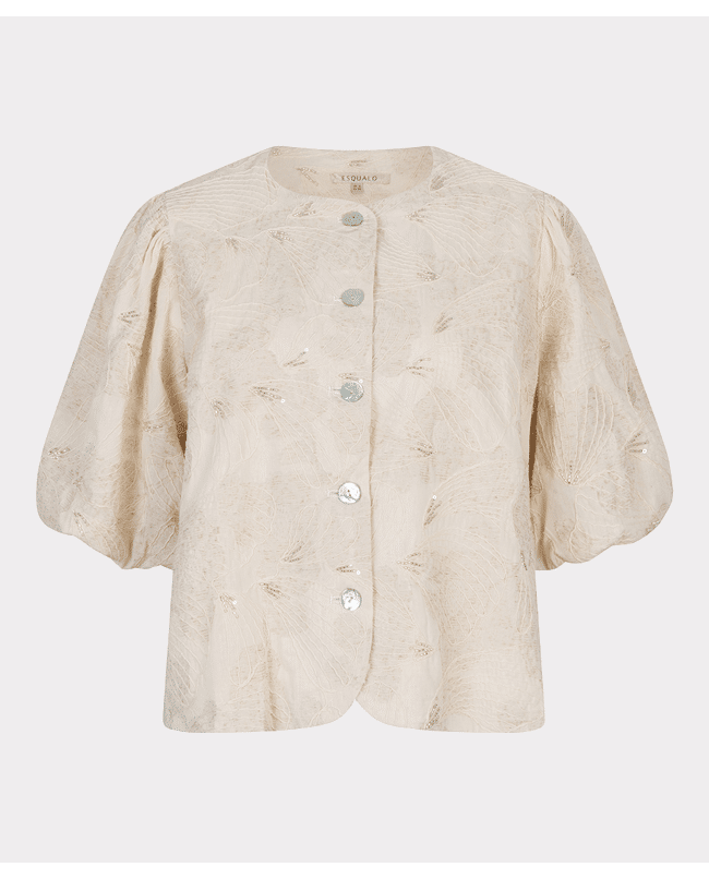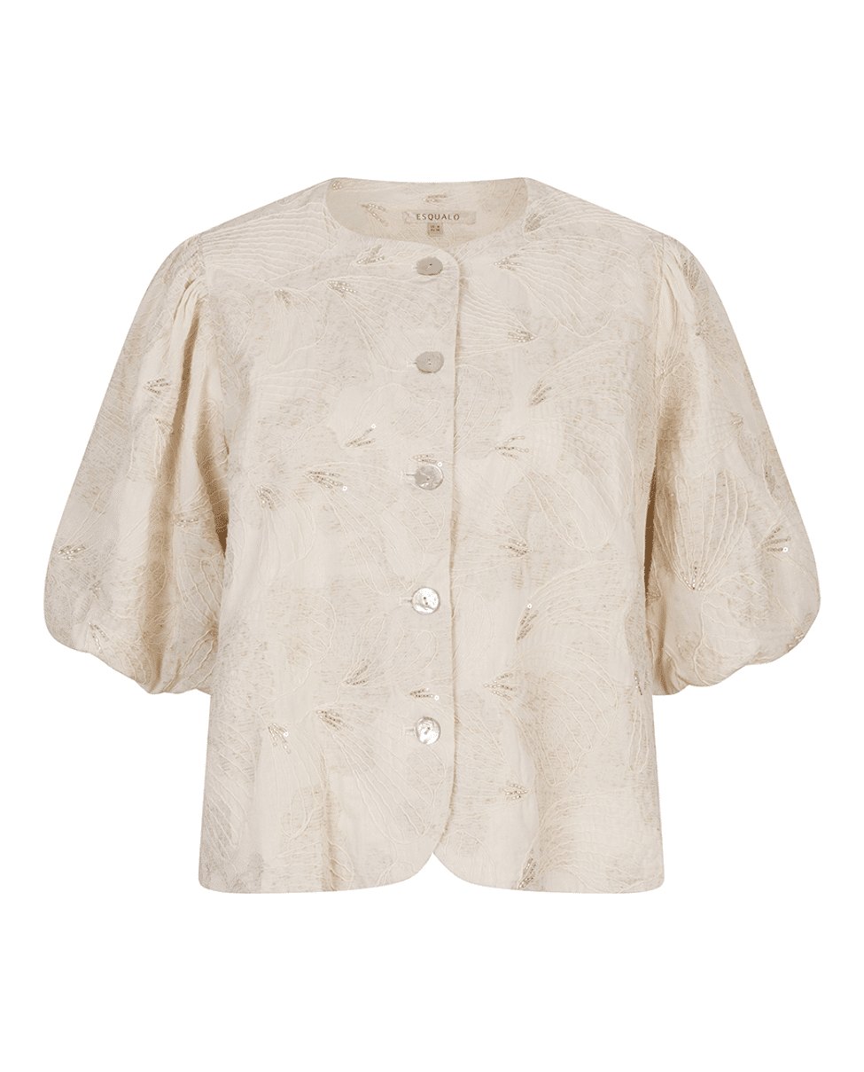 Damesblouse van Esqualo met 3D schelpen dessin, kraaltjes, ronde hals en korte ballonmouwen