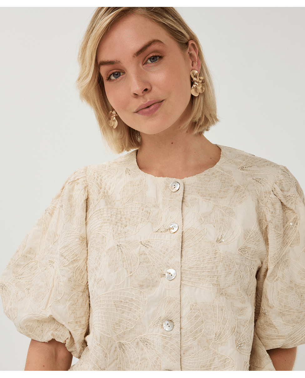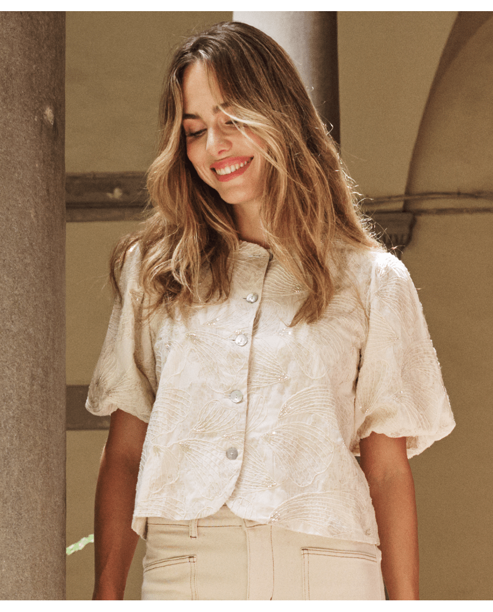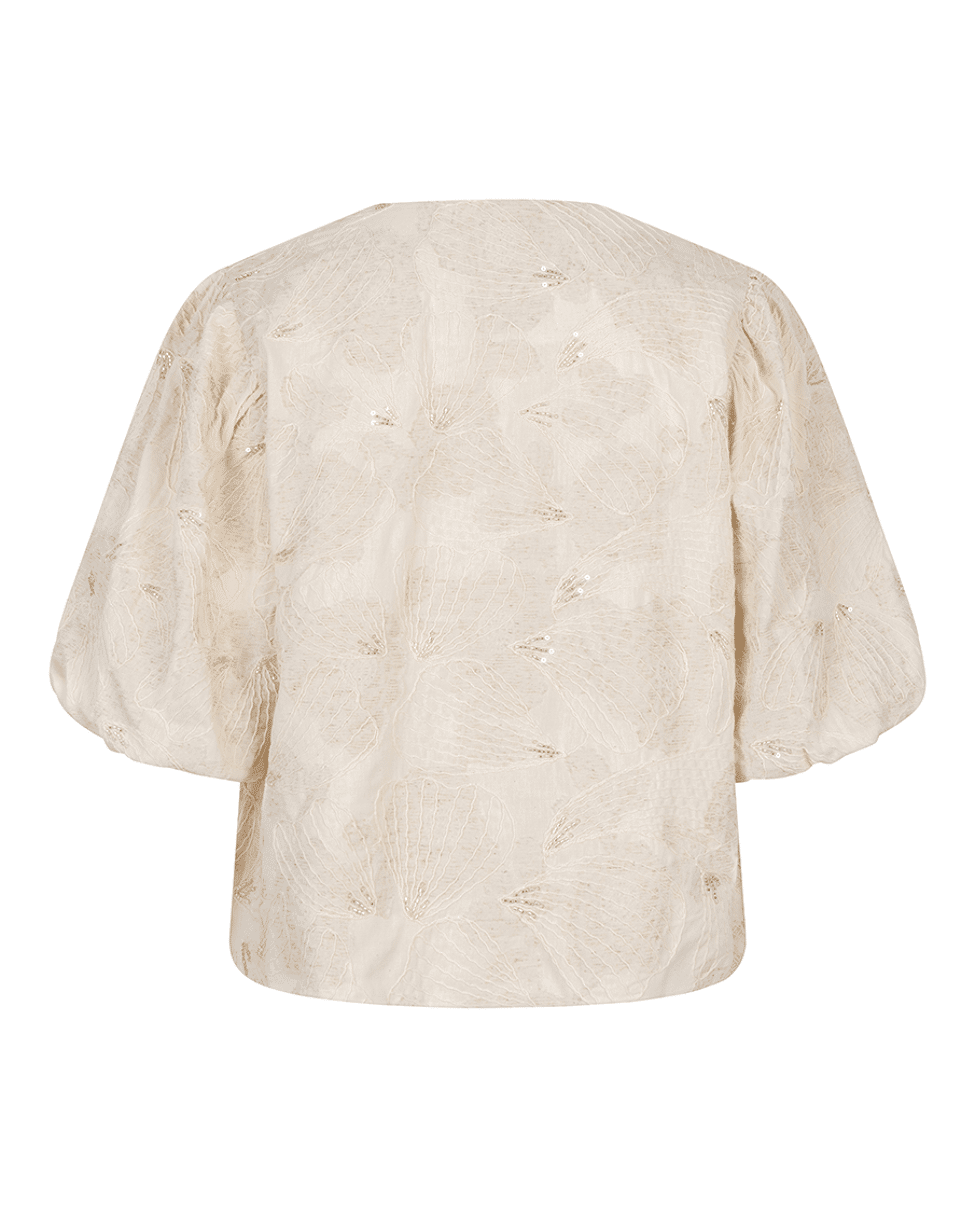 Lichte blouse met ballonmouwen en verfijnde 3D shell-structuur. De mix van katoen, linnen en viscose zorgt voor een natuurlijke feel met een elegante twist – perfect voor een frisse voorjaarslook.