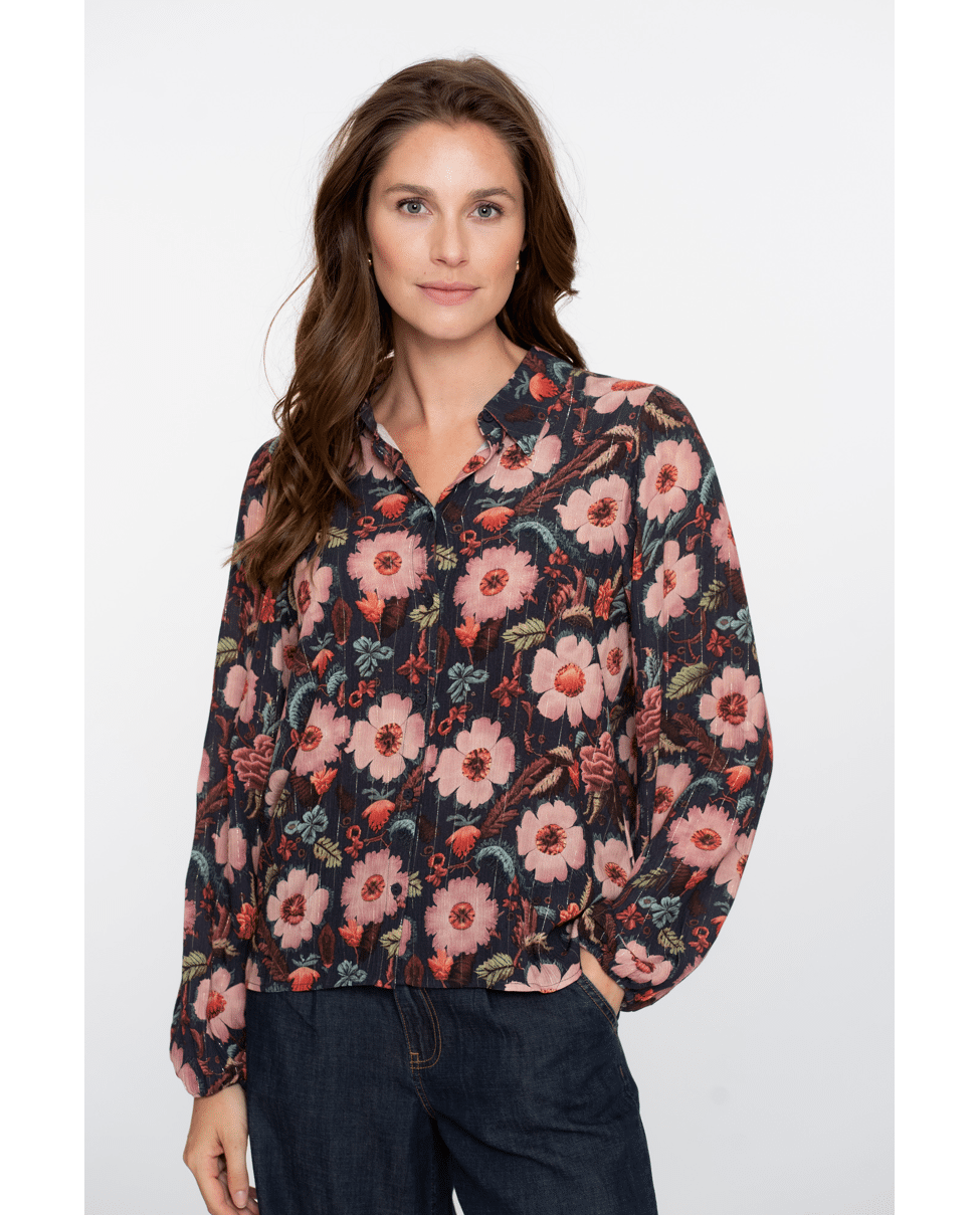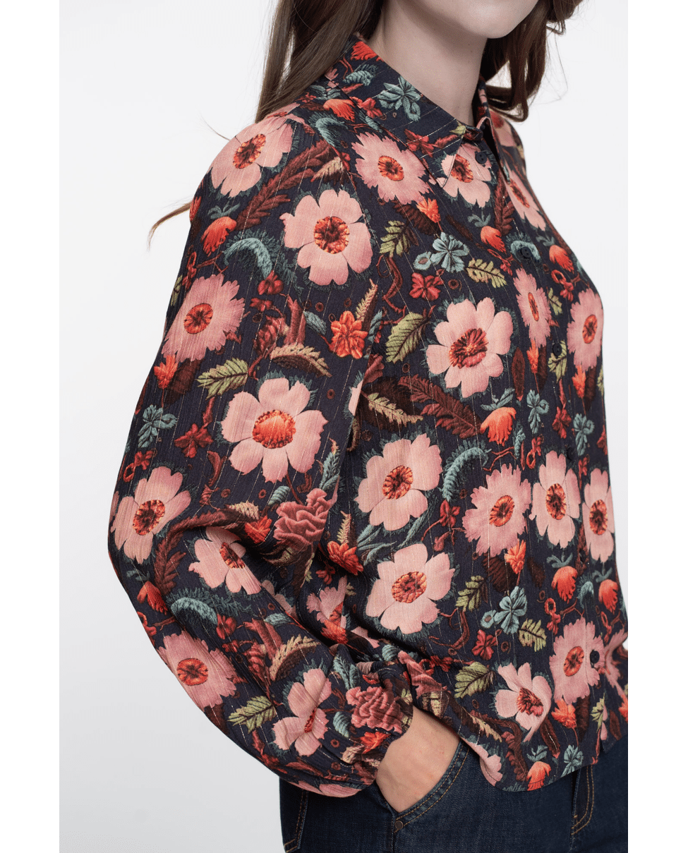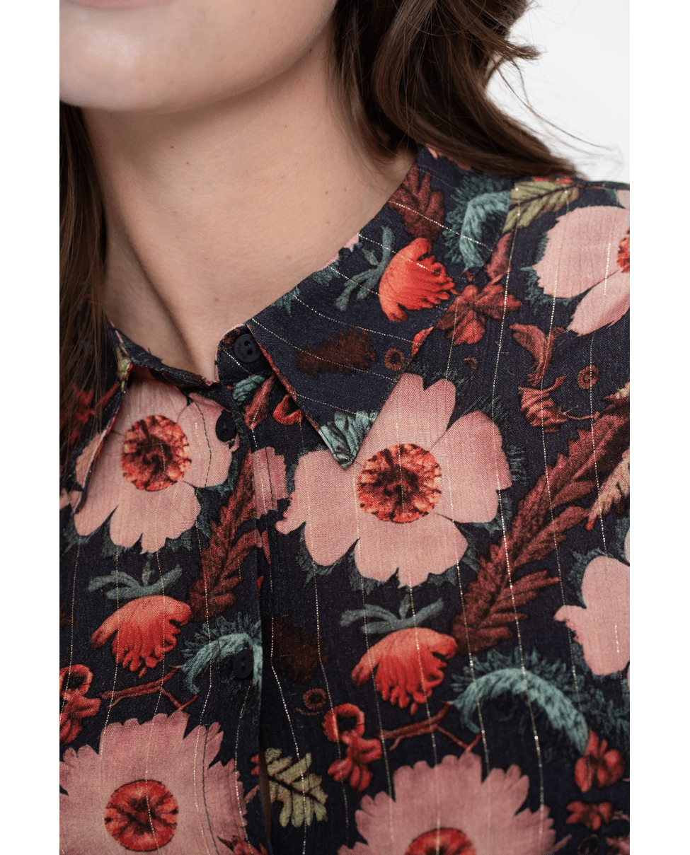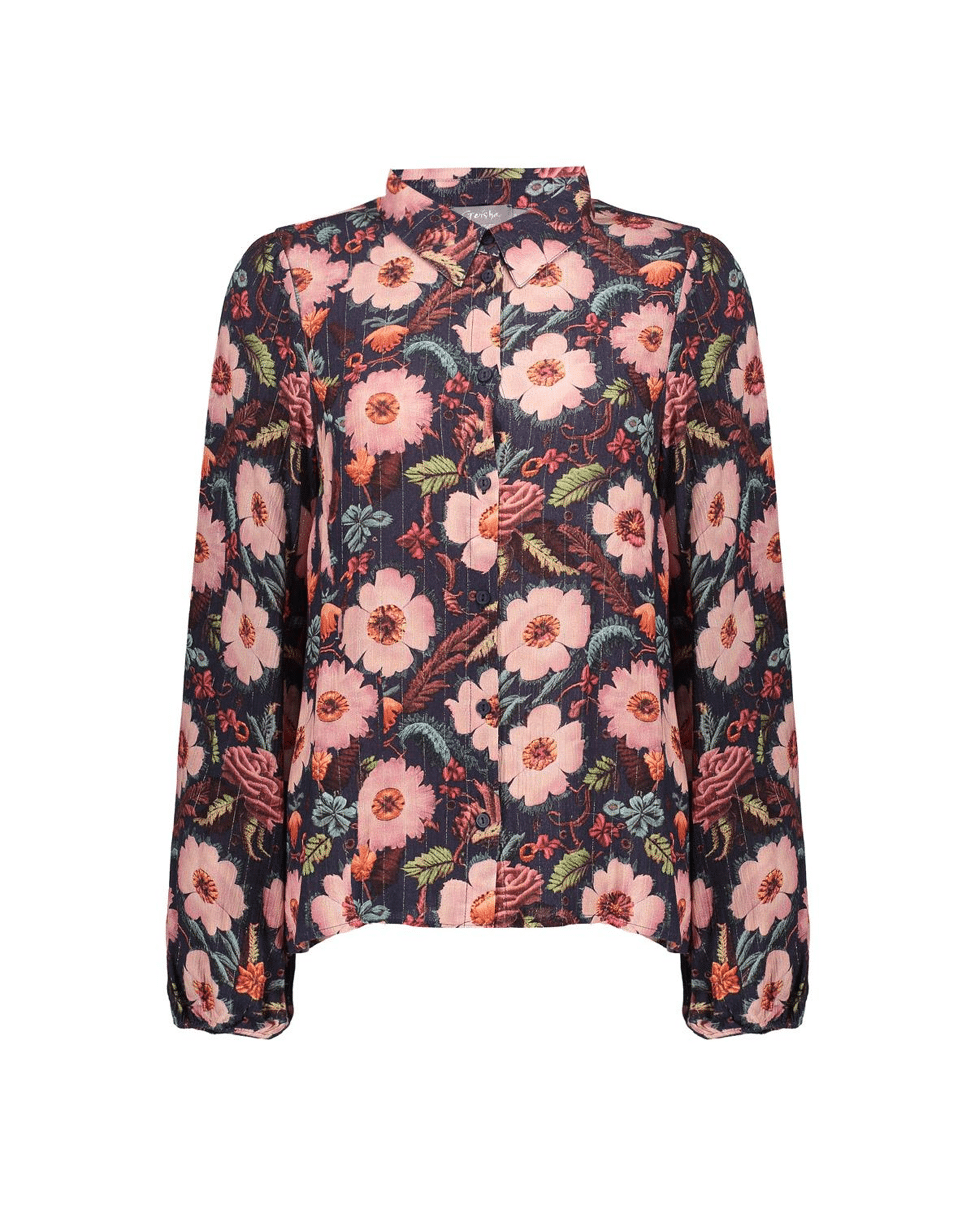 Blouse print flowers in blauw/roze is een elegante blouse met een speelse bloemenprint. De licht glanzende viscose met een vleugje metaal geeft dit item een feestelijke touch.