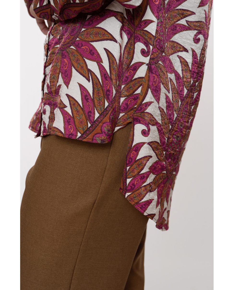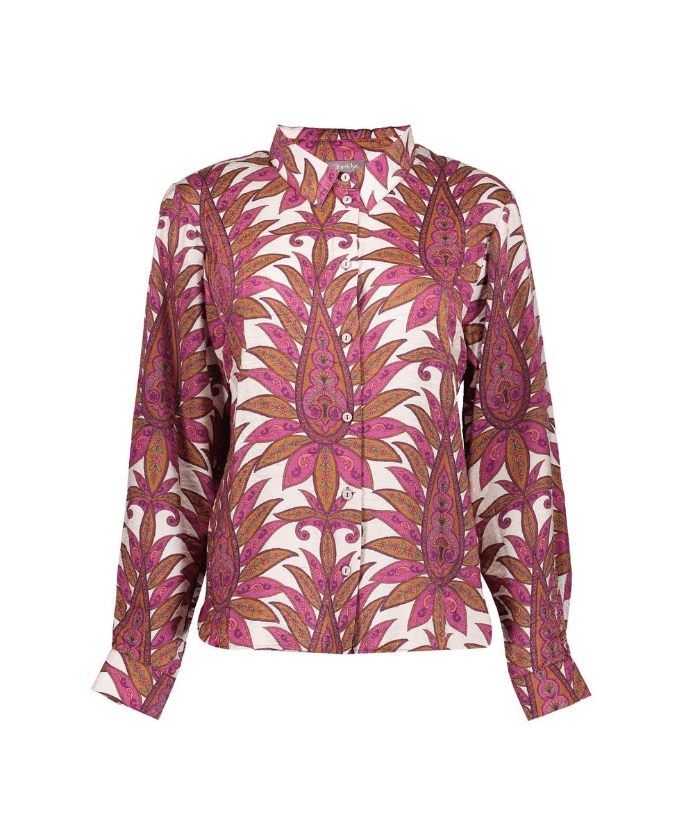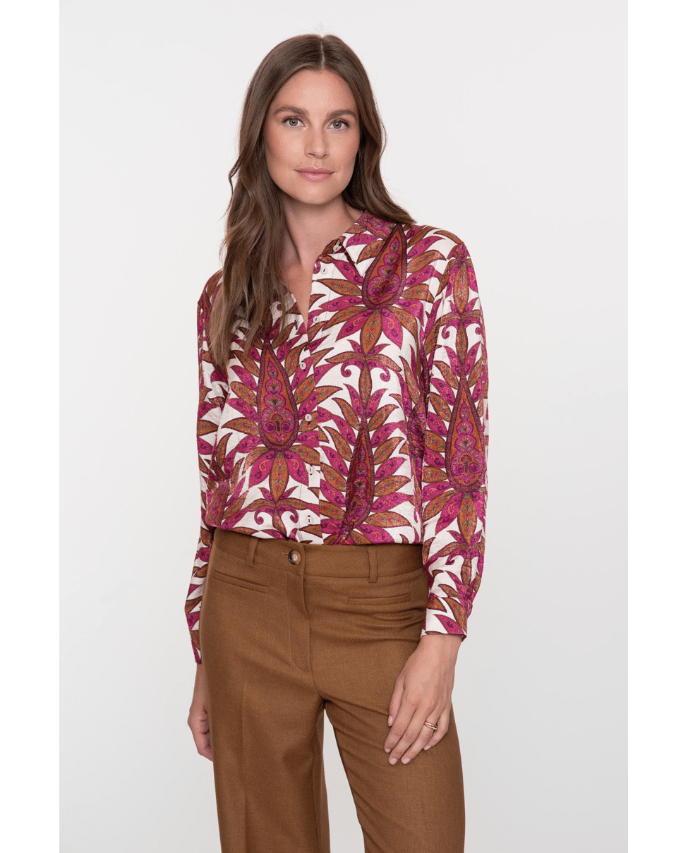 De levendige roze print op off-white ondergrond maakt deze blouse een echte blikvanger. Stijlvol met een pantalon of casual met jeans.