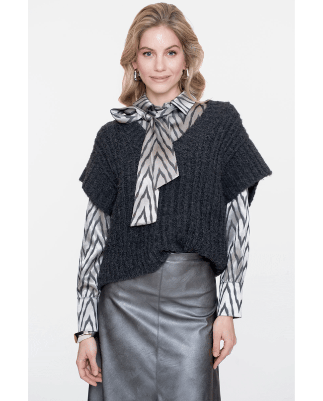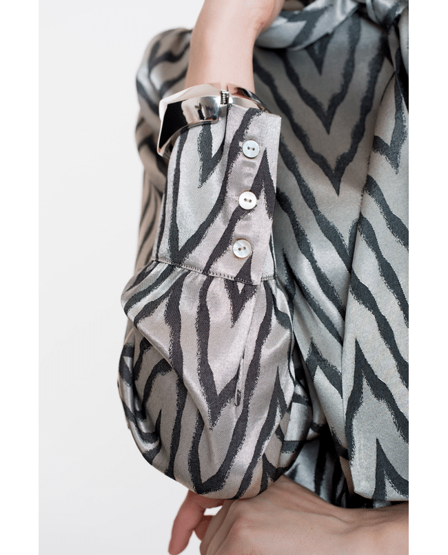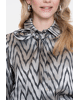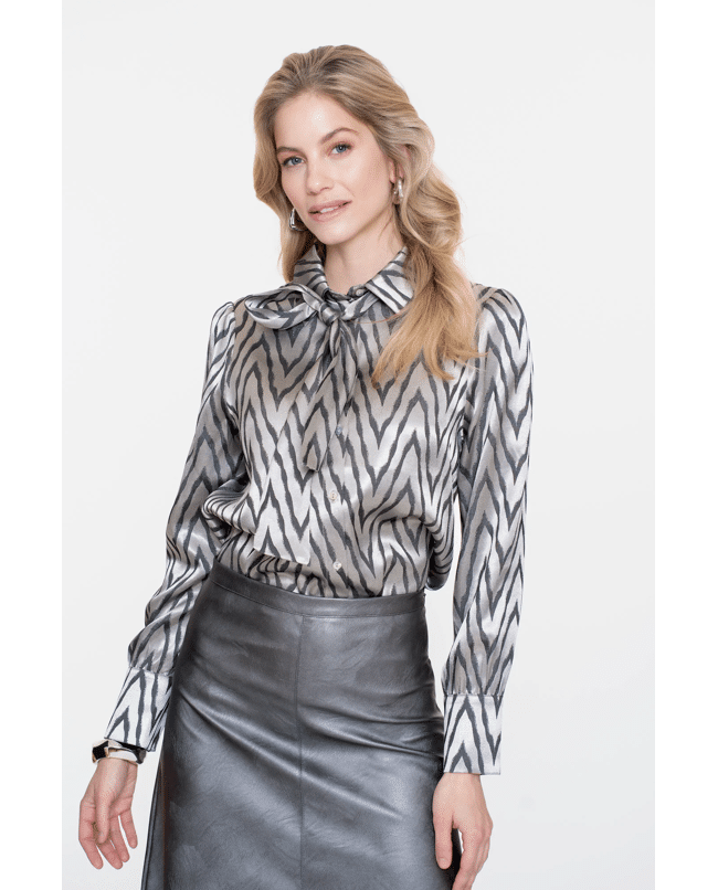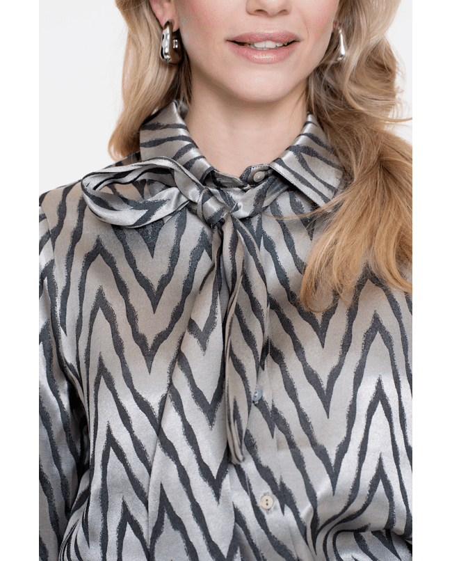 Een blouse met subtiele glans en zigzag print. De soepele stof en strikdetail bij de hals maken dit een blikvanger voor feestelijke of geklede gelegenheden.