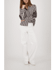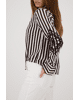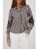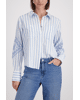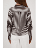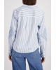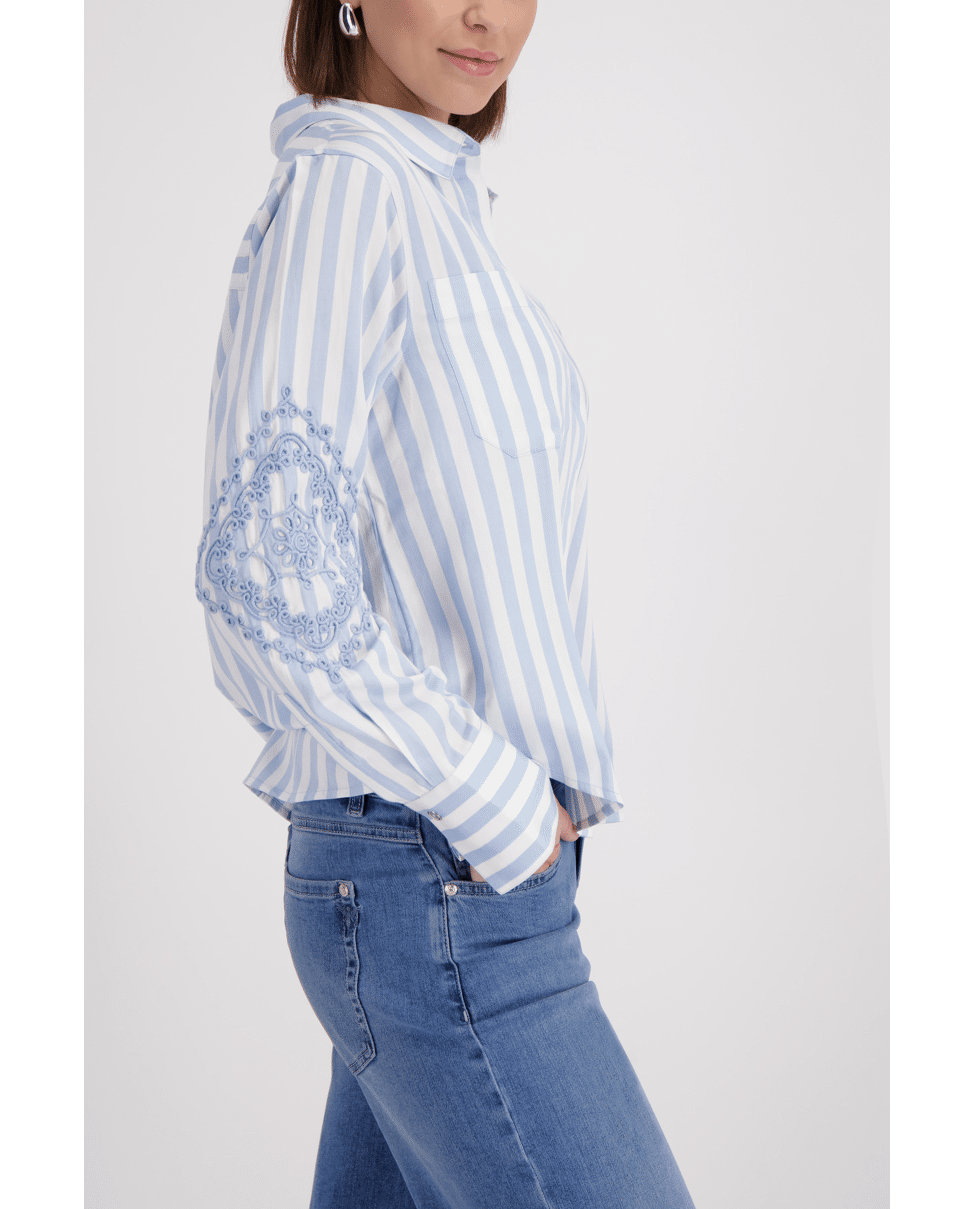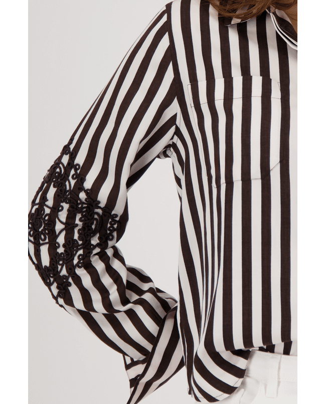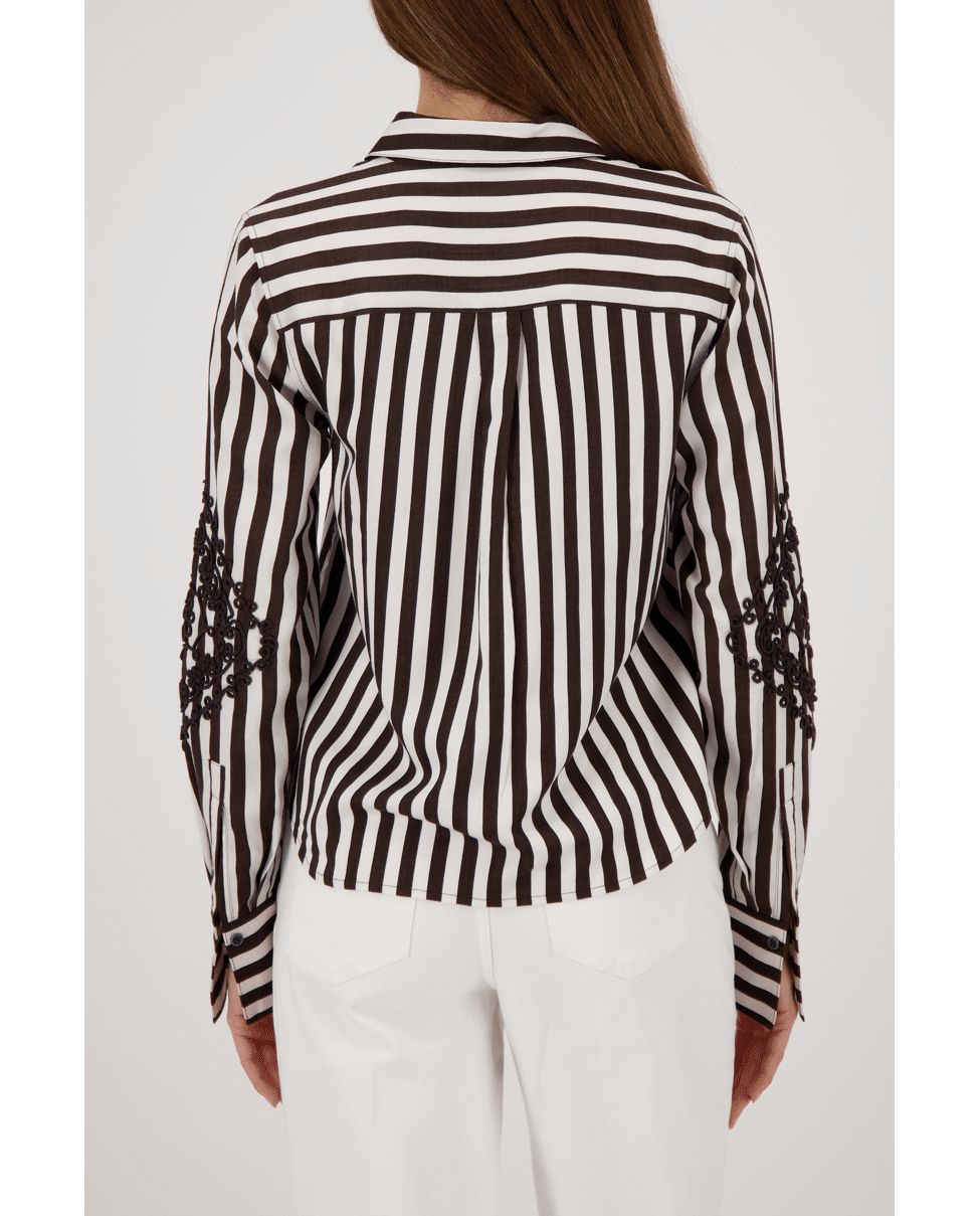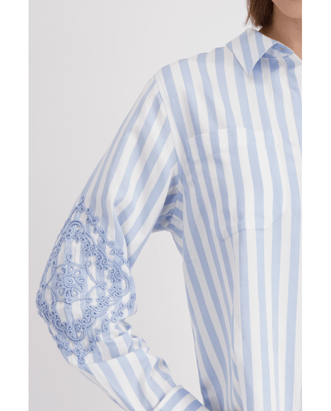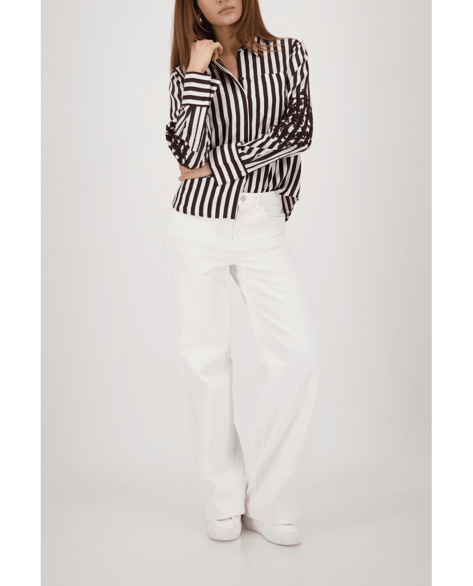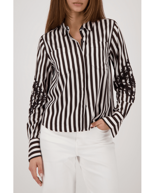 De combinatie van klassieke strepen en opvallende borduursels maakt deze blouse uniek en verrassend stijlvol.