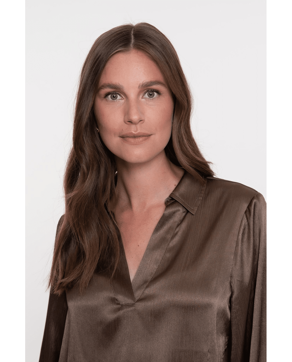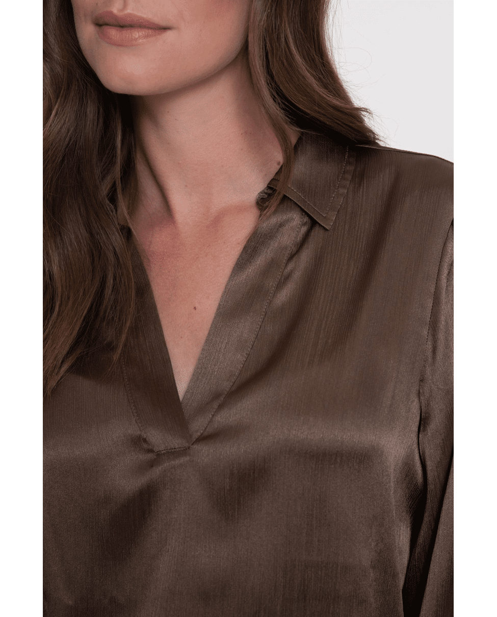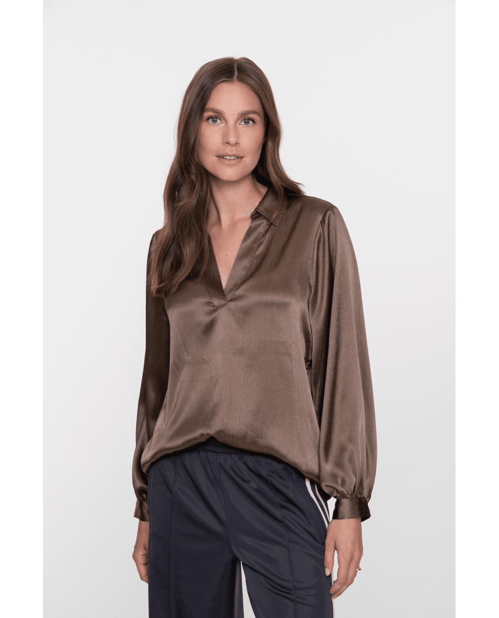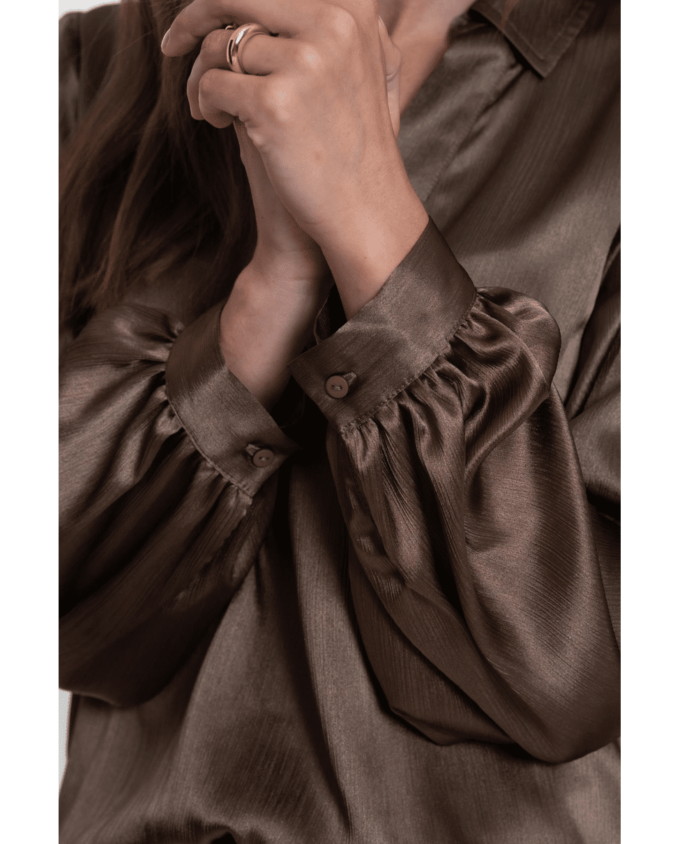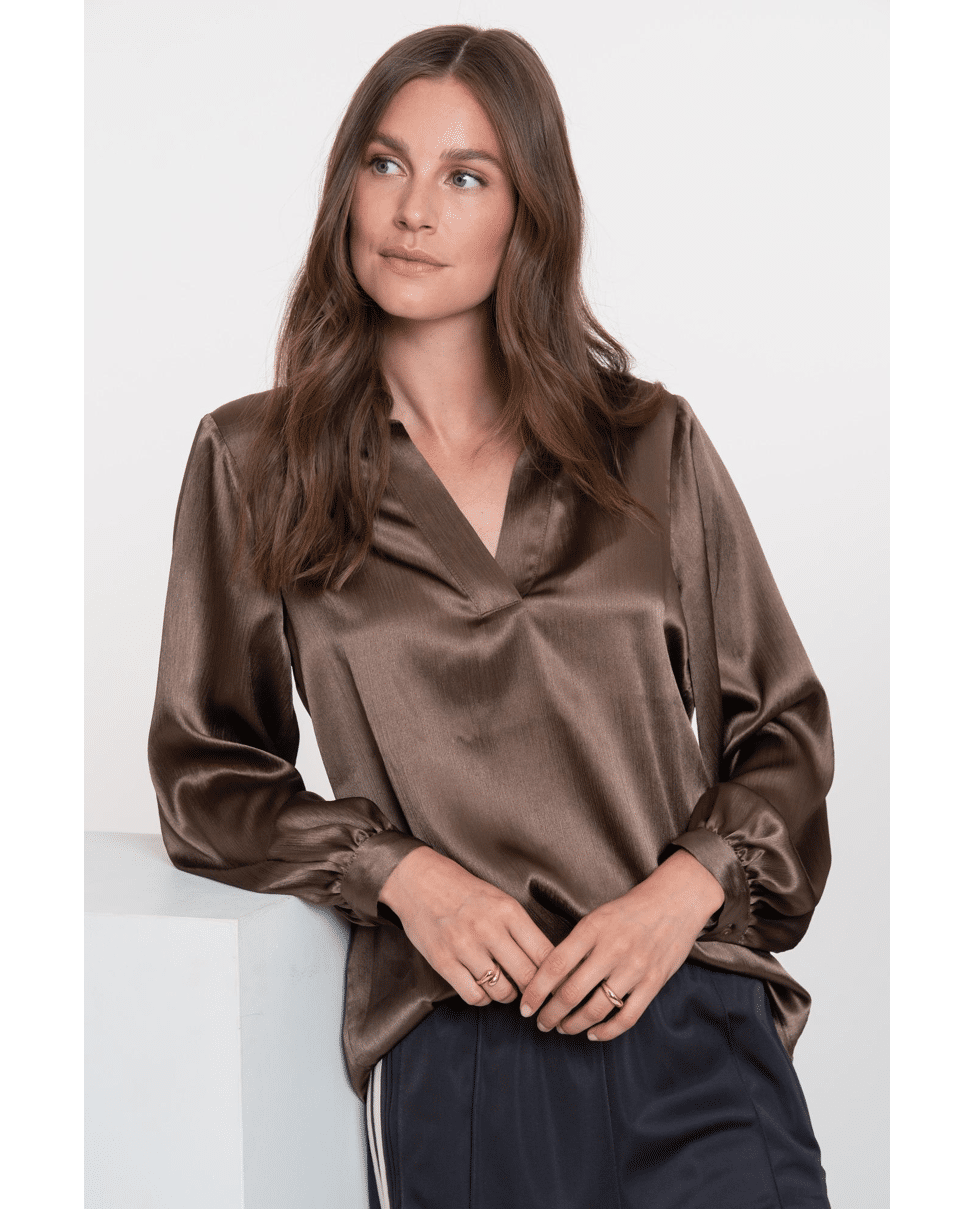 Blouse Shiny Satin – een glanzende blouse in warme bruintint met een luxe uitstraling. De soepele stof en diepe V-hals zorgen voor een elegante, vrouwelijke look.