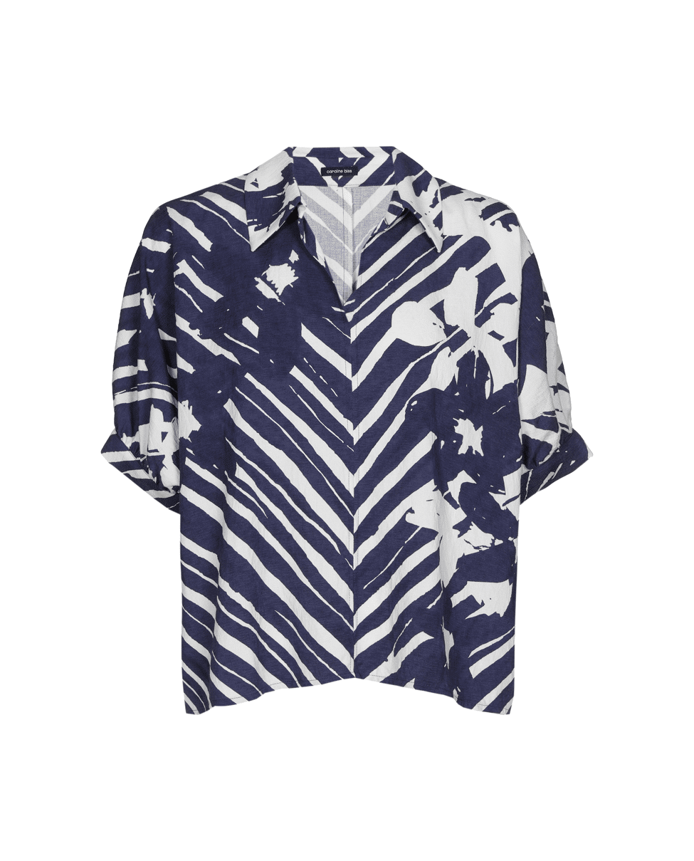 Deze losvallende blouse met diepblauwe bloemen- en streeppatroon is perfect voor een stijlvolle, luchtige look. Ideaal voor vakanties of een citytrip.
