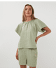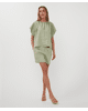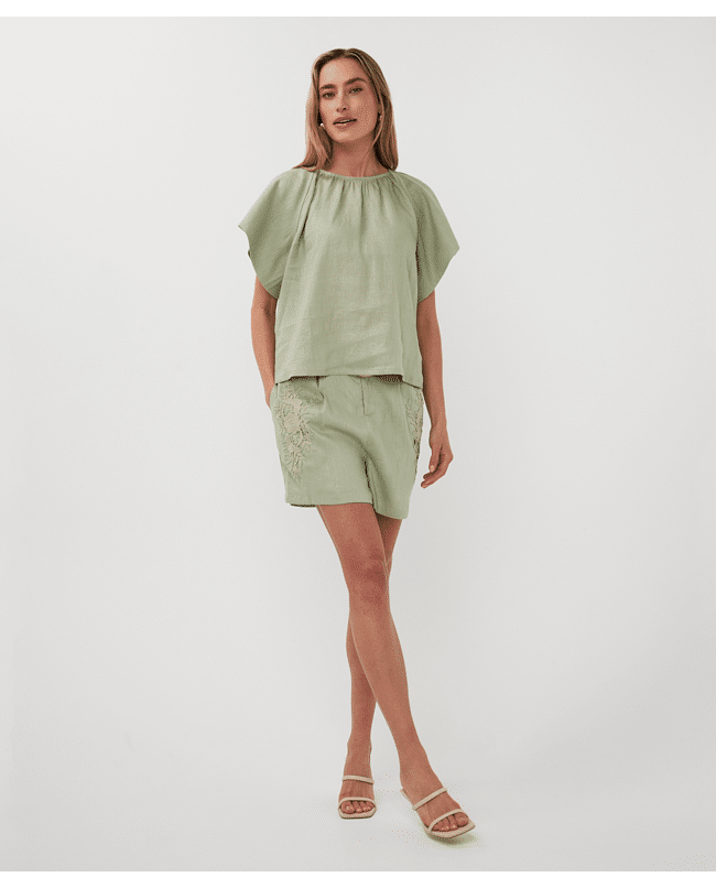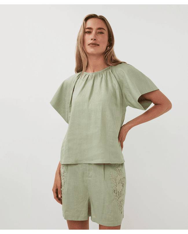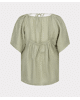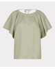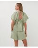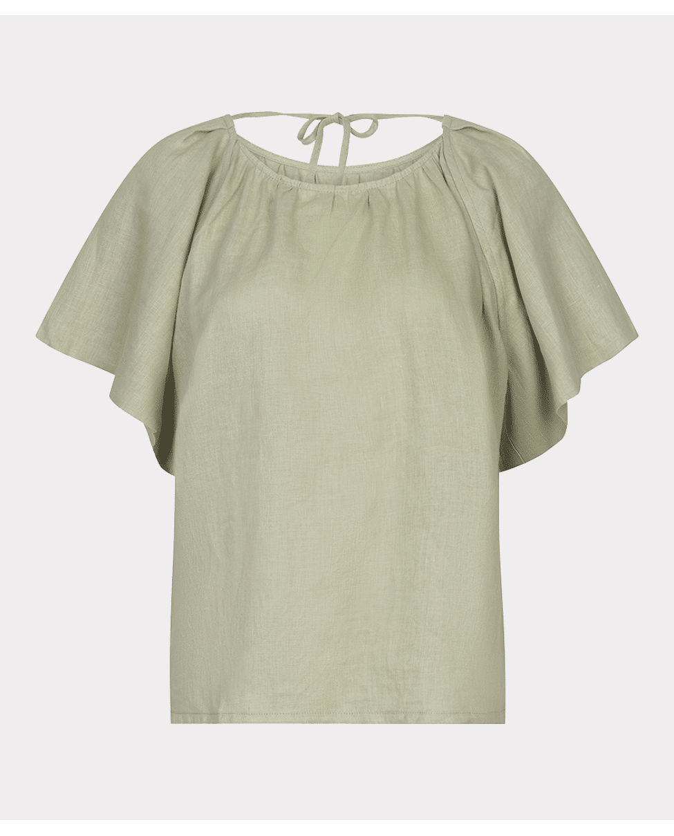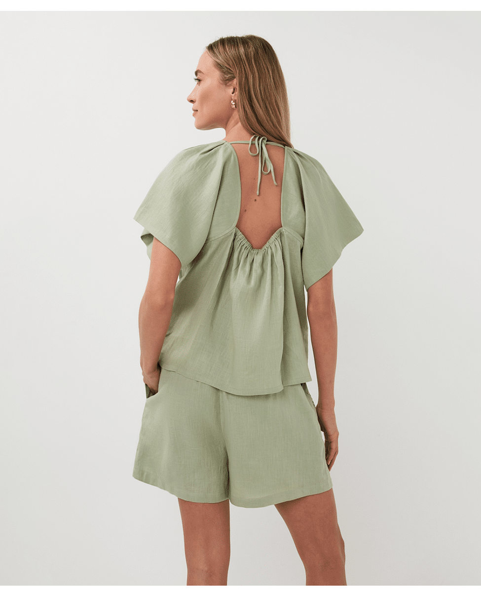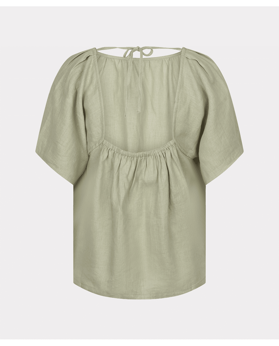 Deze linnen blousetop in zachtgroen is luchtig, vrouwelijk en verrassend van achter. De open rug met strikdetail geeft een speelse twist aan dit verder minimalistische ontwerp.