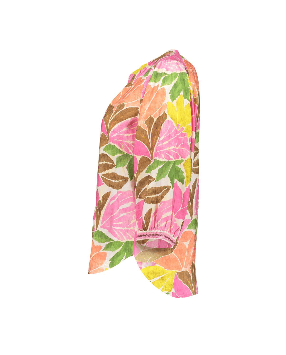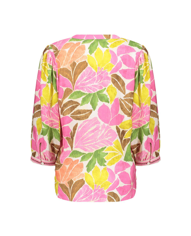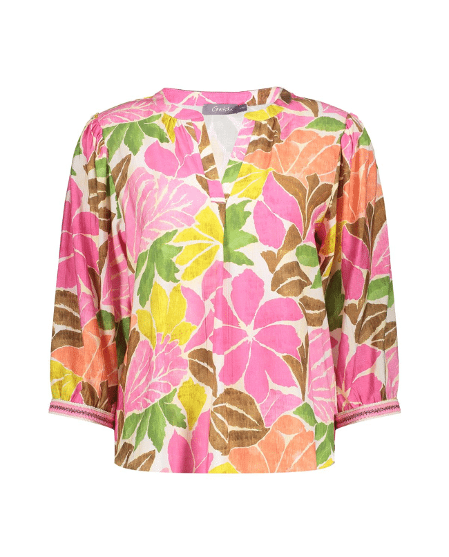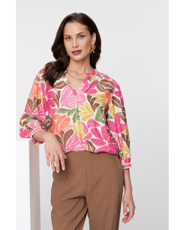 Deze luchtige blouse met vrolijke bloemenprint is perfect voor zonnige dagen. Combineer ‘m met een jeans of linnen broek voor een frisse, zomerse look.