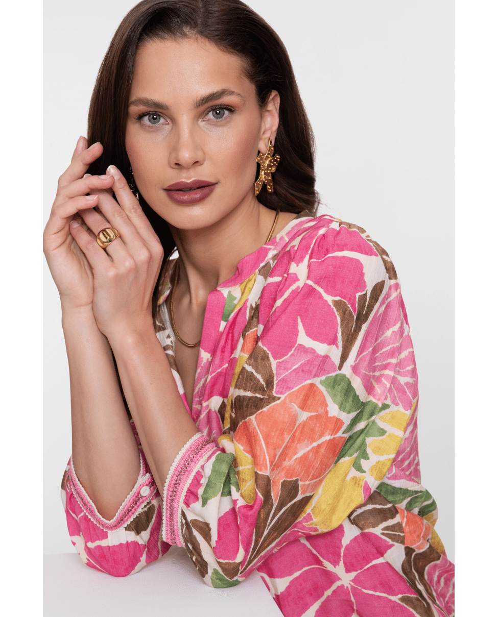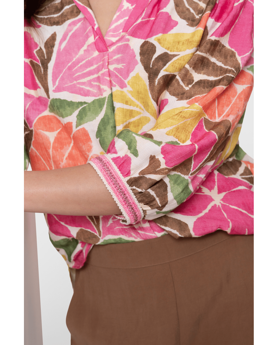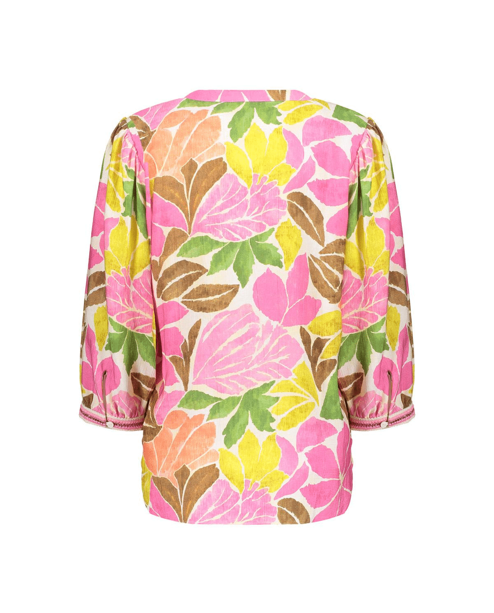 Deze luchtige blouse met vrolijke bloemenprint is perfect voor zonnige dagen. Combineer ‘m met een jeans of linnen broek voor een frisse, zomerse look.