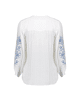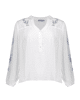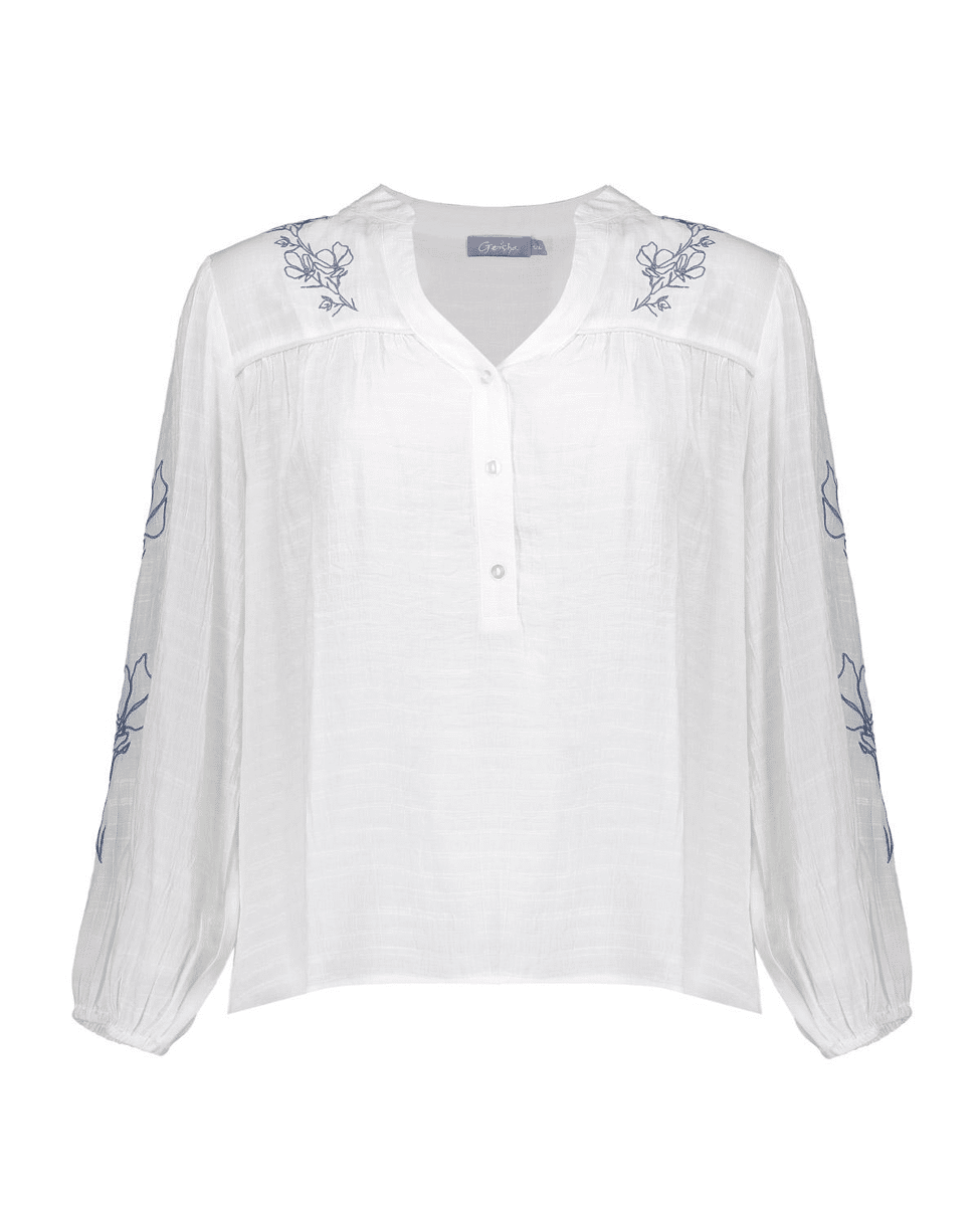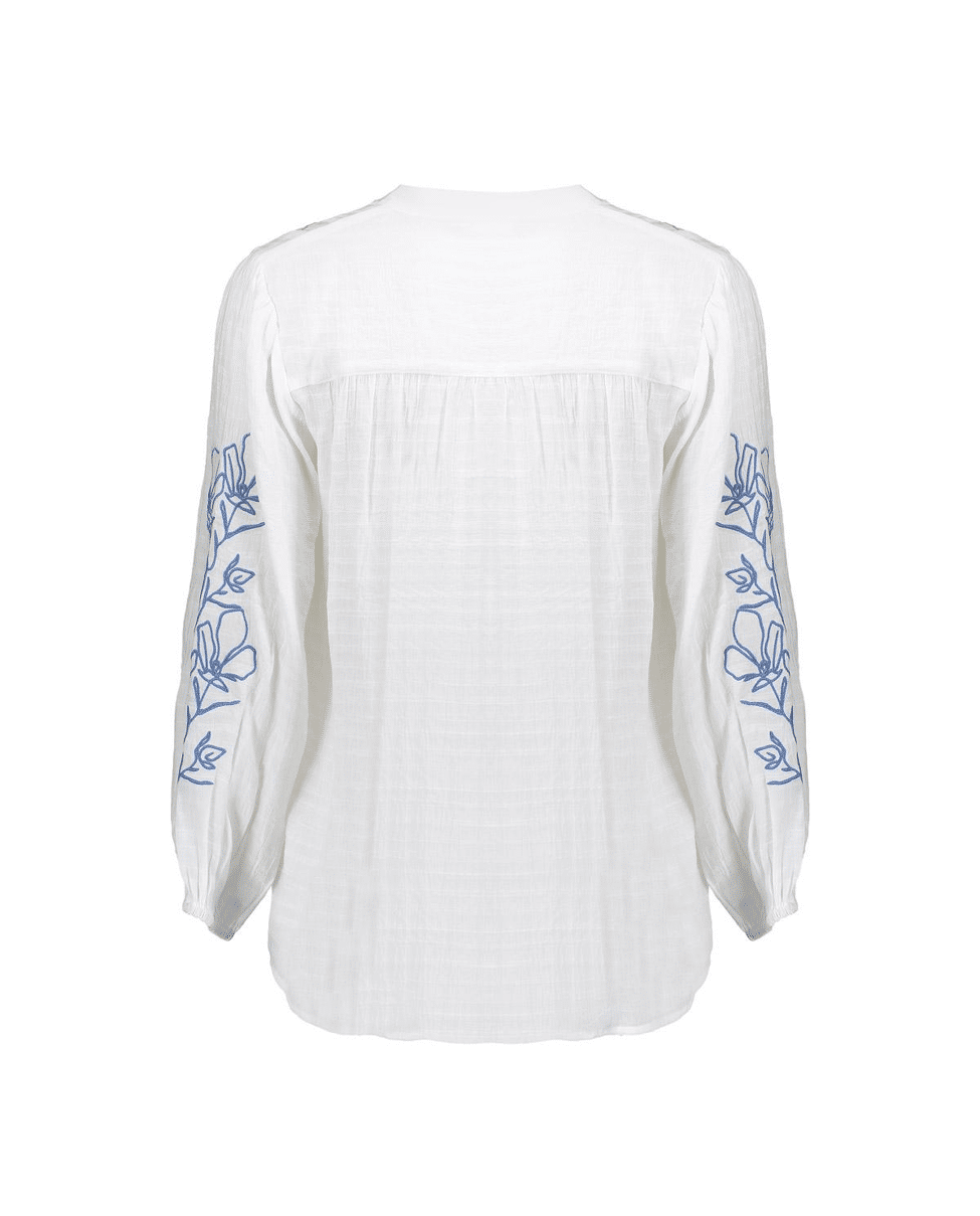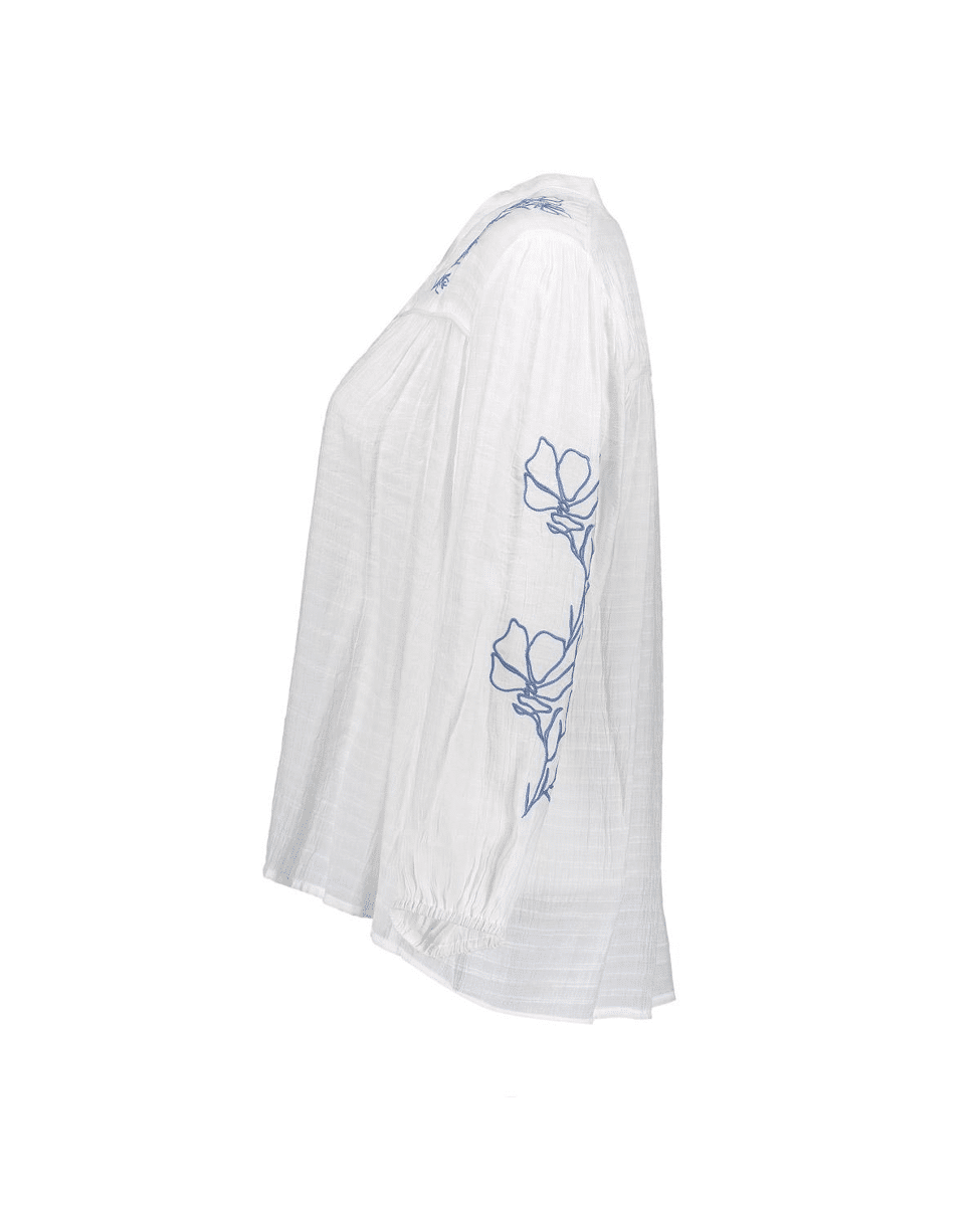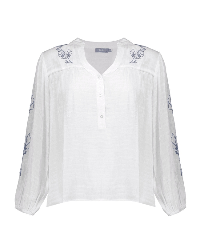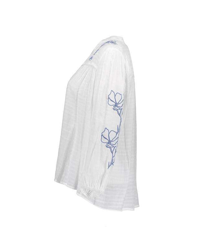 Een luchtige blouse met subtiele details – perfect voor zomerse dagen waarop je comfortabel én verzorgd voor de dag wilt komen. De blauwe borduursels geven een frisse twist aan het witte canvas.