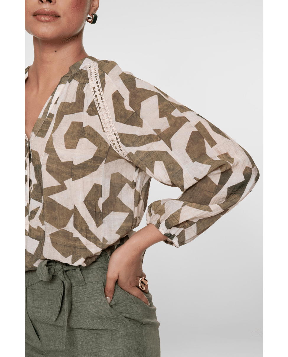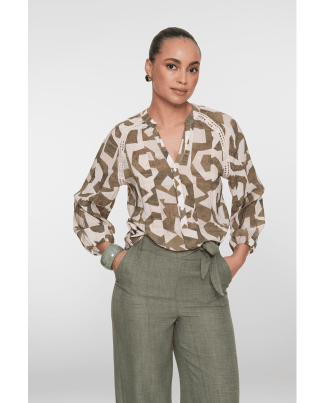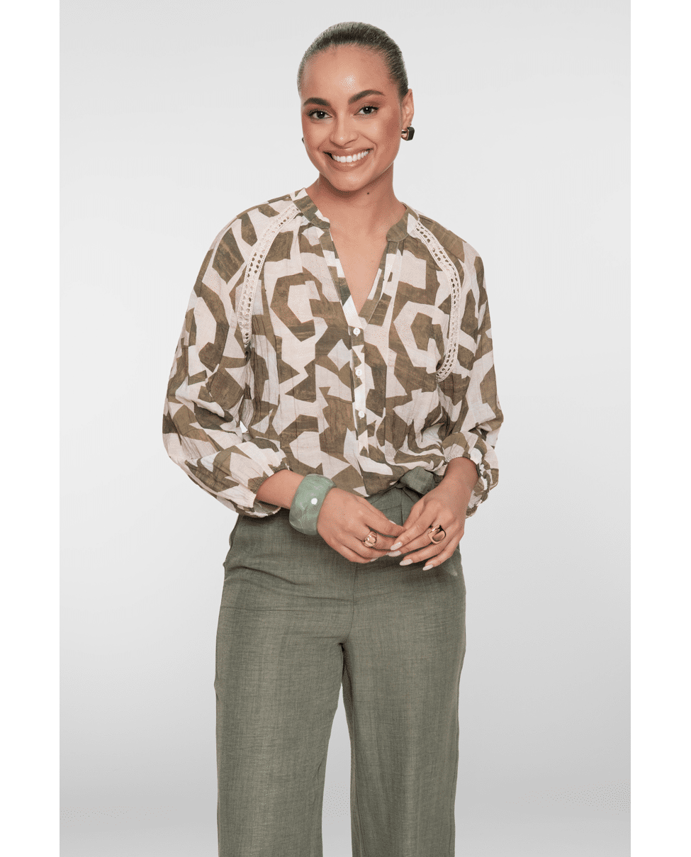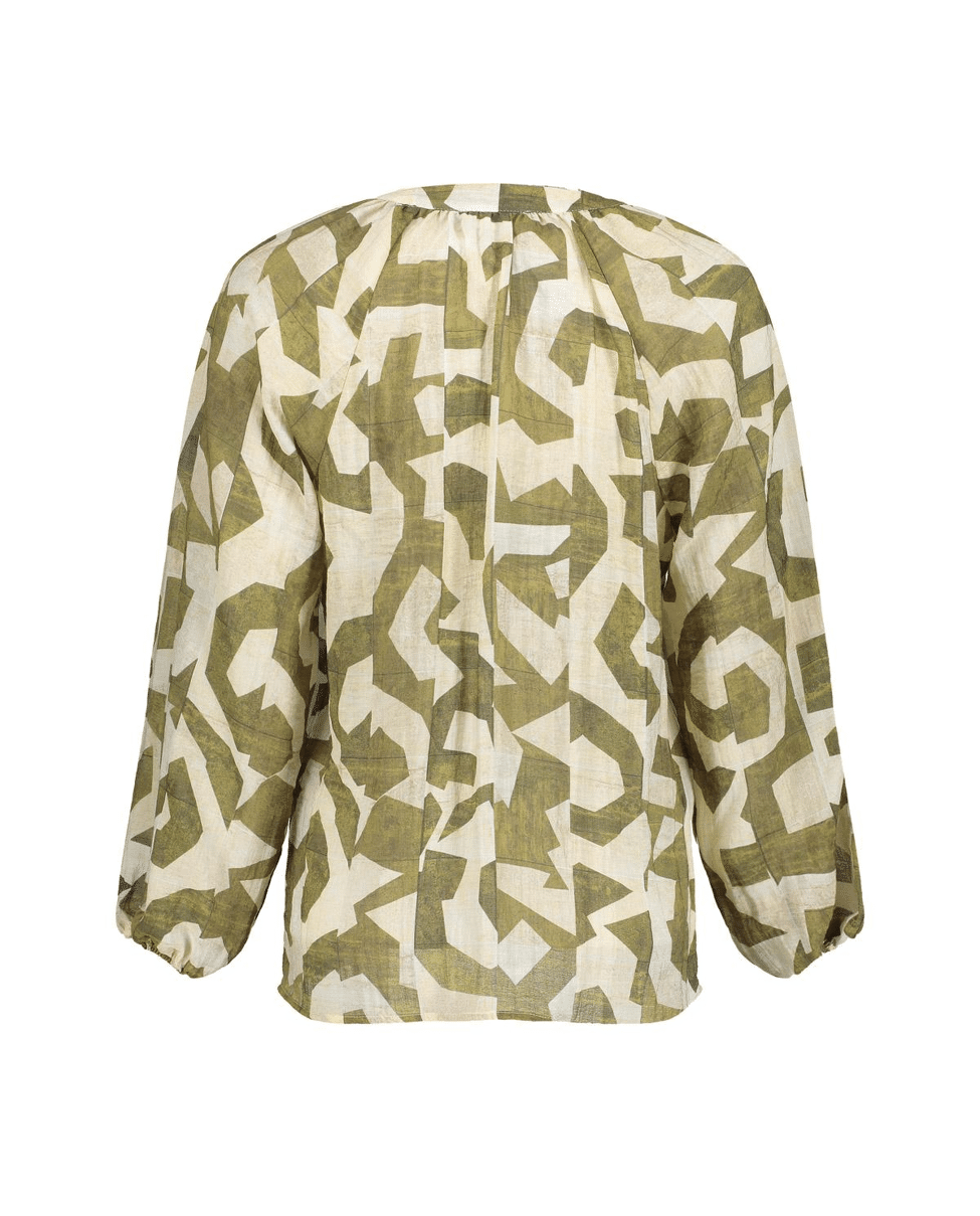 Deze luchtige top met abstracte print in ecru en olijfgroen is een subtiele blikvanger. Perfect voor zomerse dagen waarop comfort en stijl hand in hand gaan.