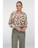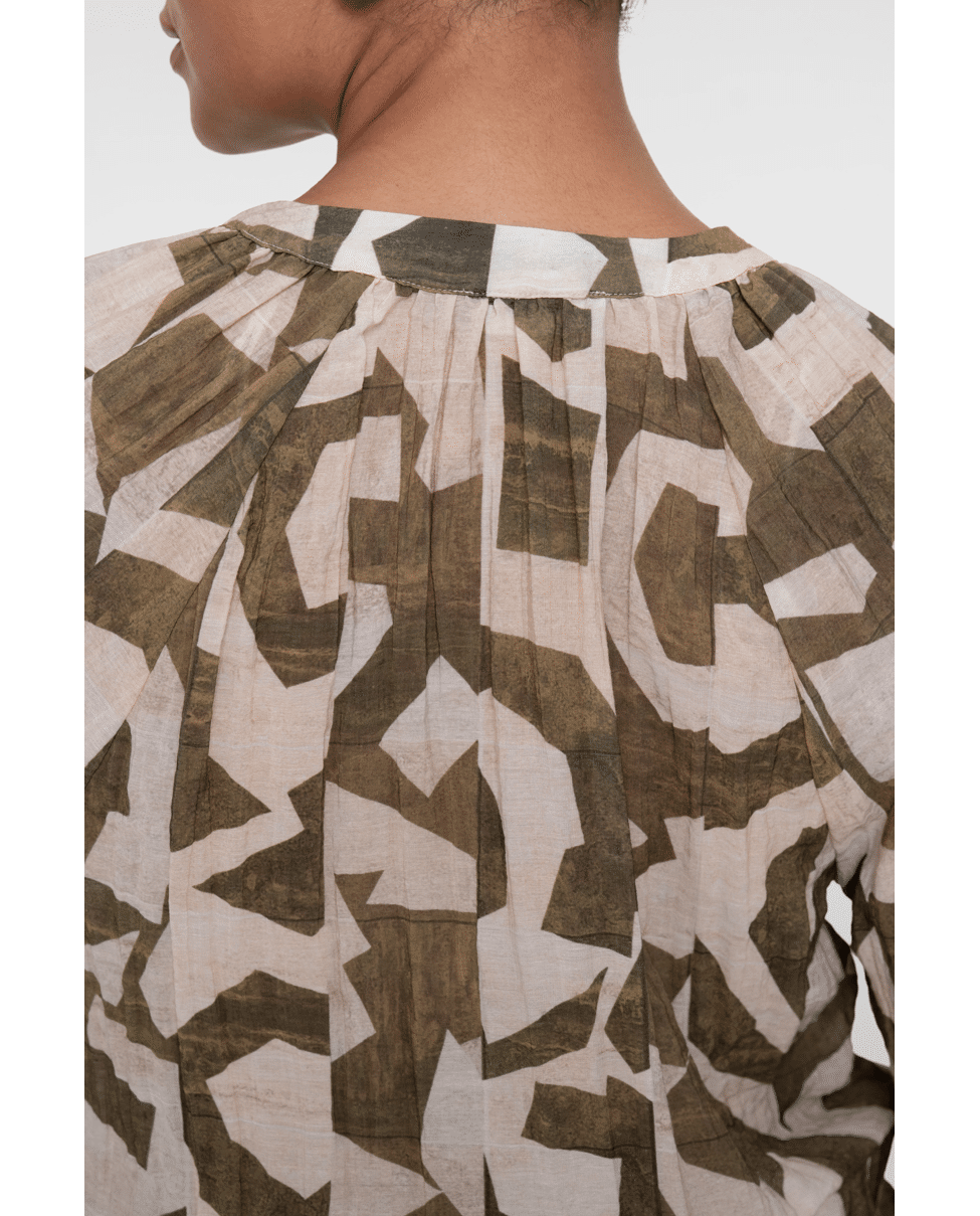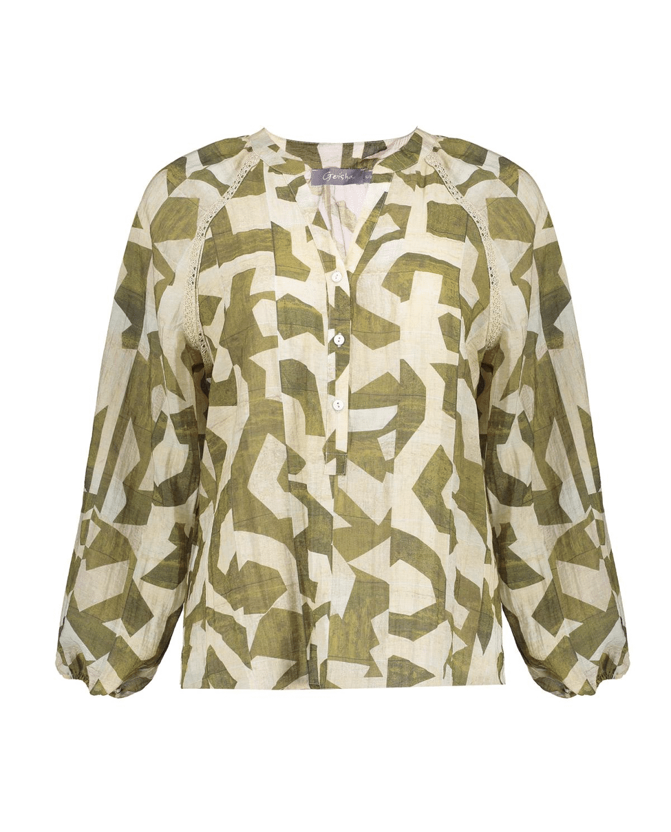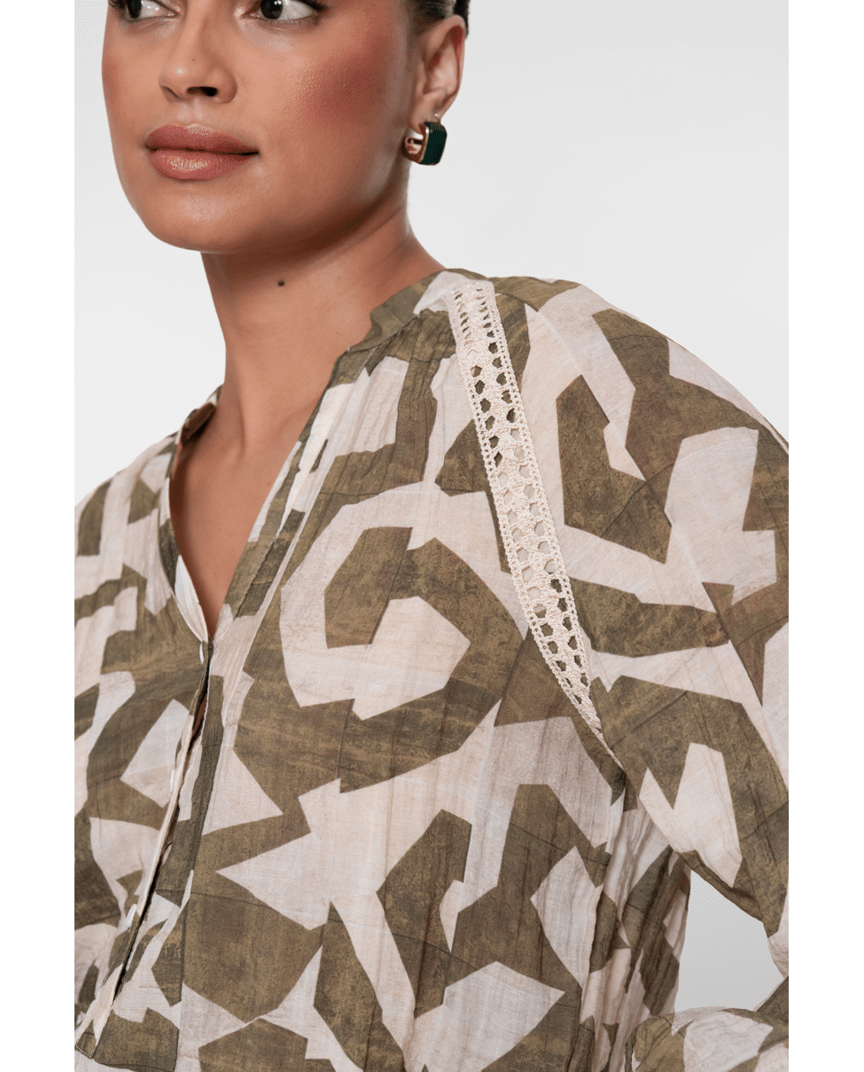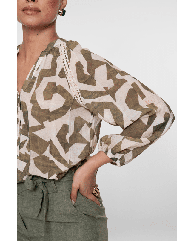Deze luchtige top met abstracte print in ecru en olijfgroen is een subtiele blikvanger. Perfect voor zomerse dagen waarop comfort en stijl hand in hand gaan.