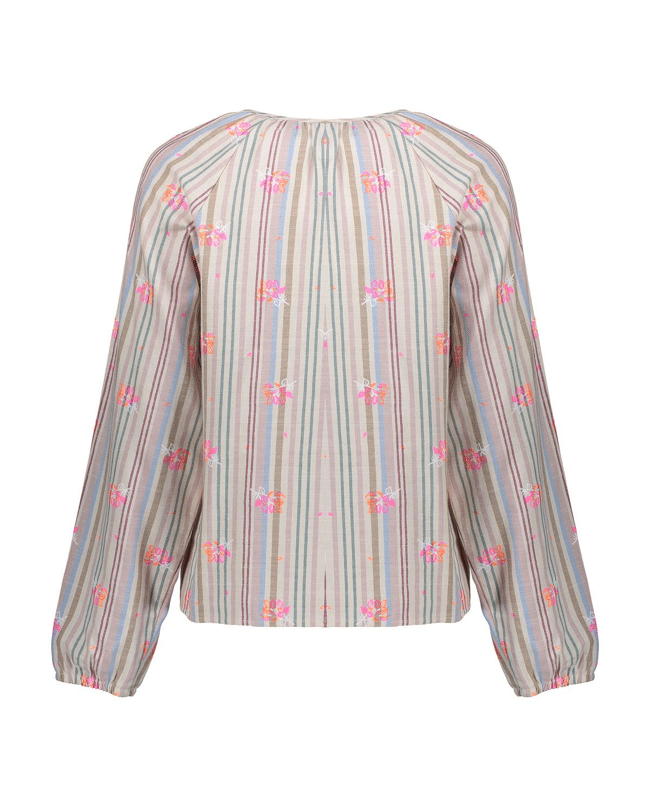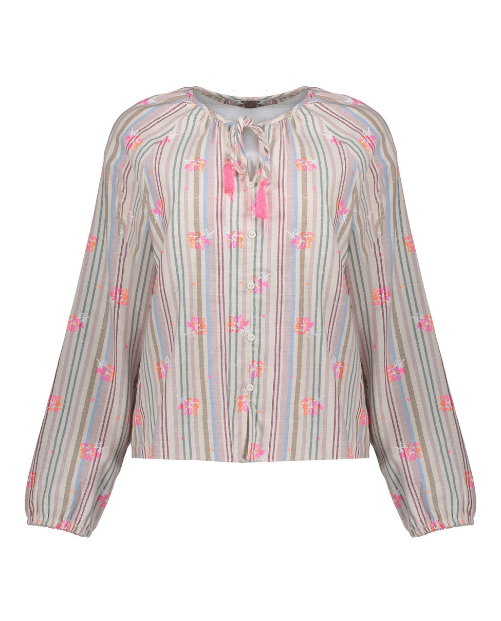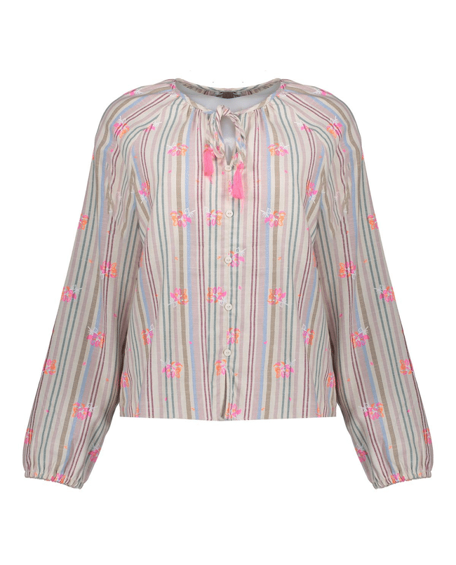 Deze katoenen blousetop combineert een speels streepdessin met subtiele bloemenprints. Ideaal voor een luchtige, vrouwelijke zomerdag.