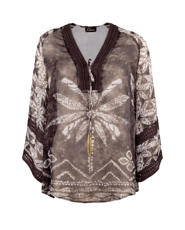 Dit is een dames chiffonblouse met tie-dye print van Grace, uitgevoerd in warme bruintinten met subtiele crèmekleurige accenten. De luchtige stof, V-hals en decoratieve details geven de blouse een bohemian en vrouwelijke uitstraling. Perfect voor een zomerse dag of een stijlvolle, casual look.