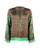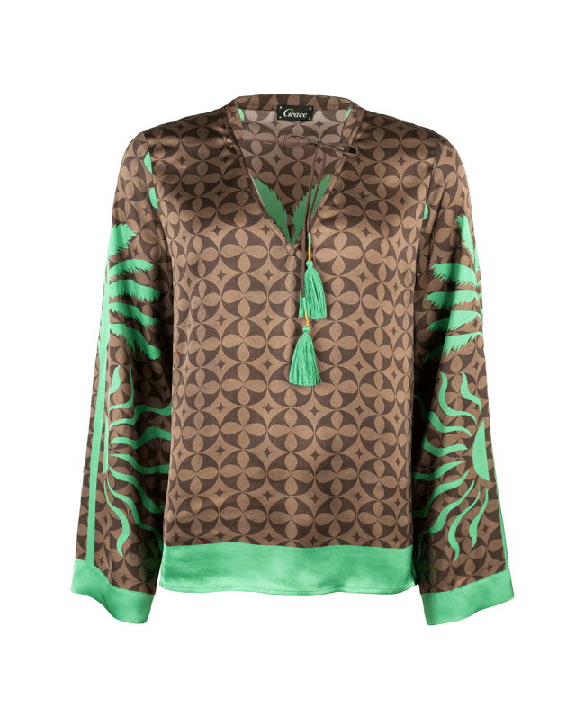 Dit is een dames blousetop met geometrische print van Grace, uitgevoerd in warme bruintinten met frisse groene accenten. De V-hals met striklint en de soepele stof geven de top een stijlvolle, ontspannen uitstraling. Mooi te combineren met de bijpassende broek voor een complete set.