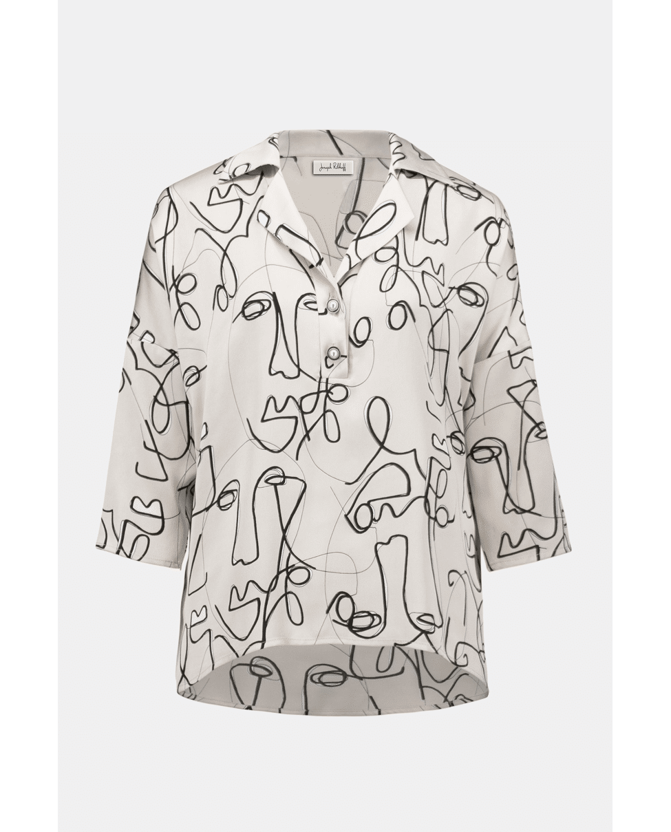 Dames blousetop van Joseph Ribkoff met een artistieke allover gezichtenprint. De ¾ mouwen en de reverskraag met V-hals en knopen maken deze blouse speels én stijlvol tegelijk.
