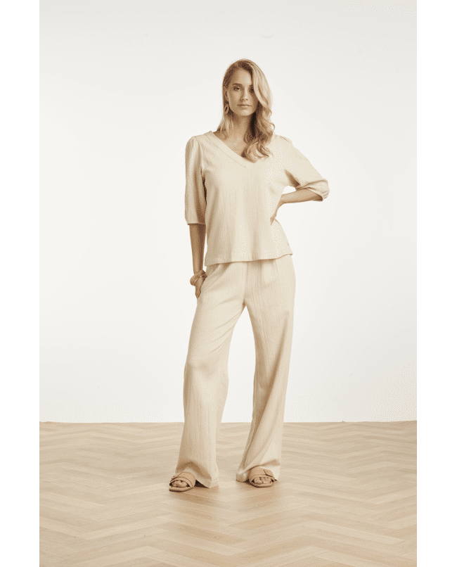 Het ton-sur-ton borduurwerk op de mouwen geeft deze top een verfijnd en vrouwelijk karakter. De natuurlijke structuur van de stof zorgt voor een ontspannen, boho-chic uitstraling.