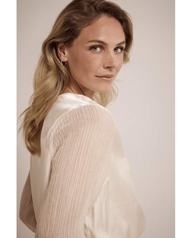 De stofmix en het plooidetail zorgen voor een speels maar stijlvol effect. Perfect voor zowel werk als vrije tijd.