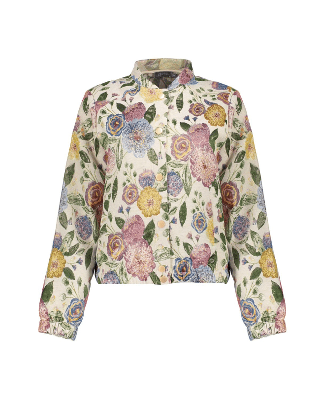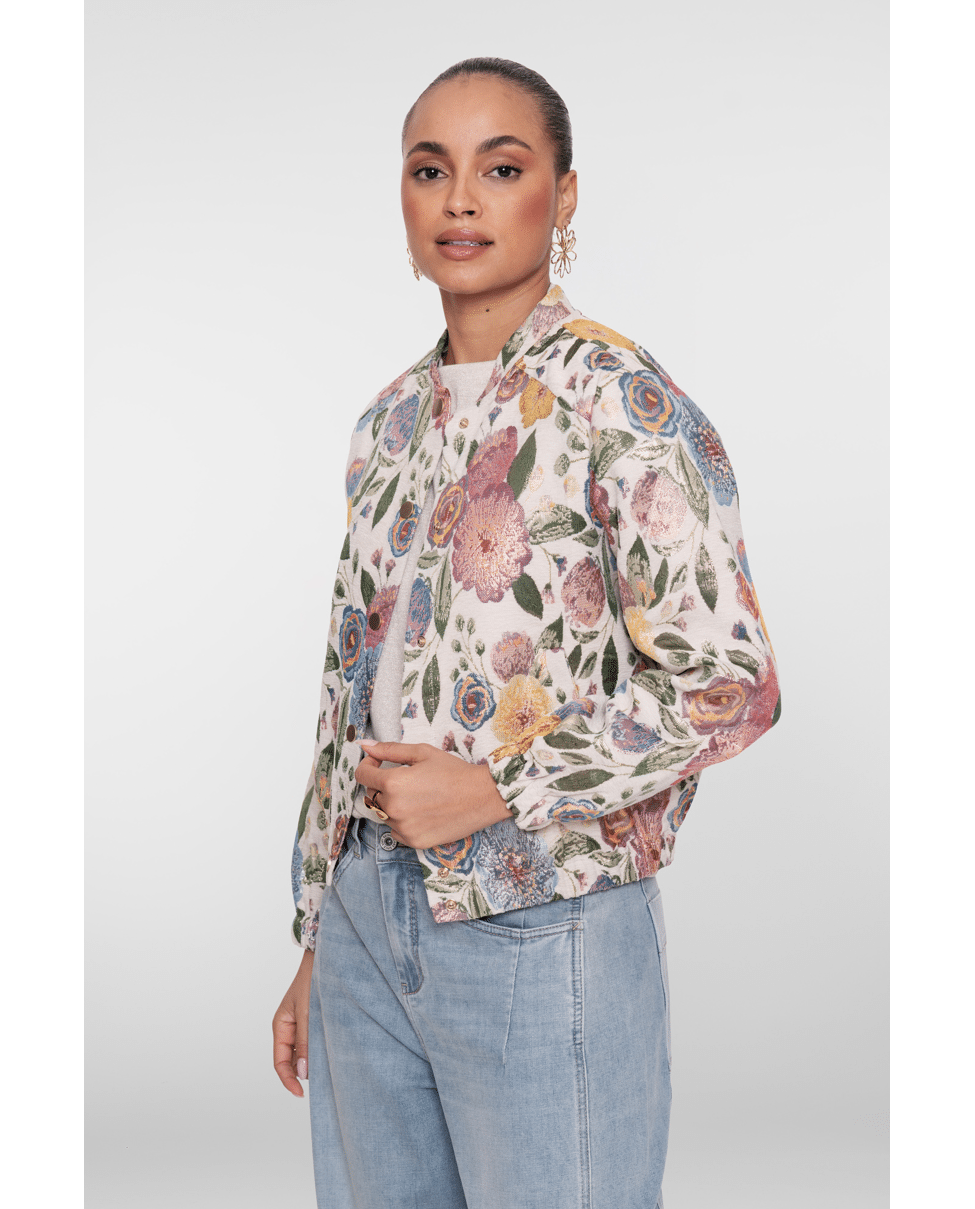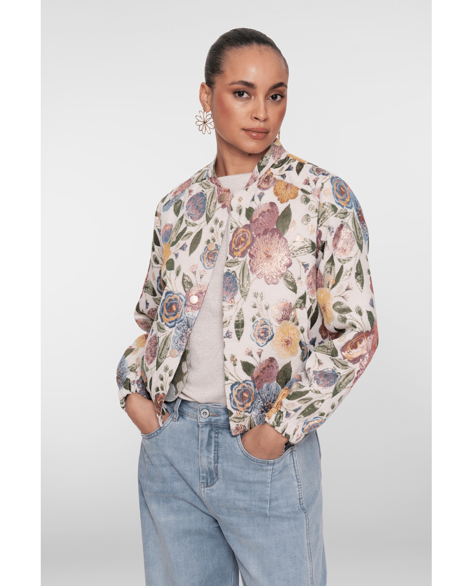 De jacquard bloemenstructuur en zachte glans maken van dit jack een echte eyecatcher – stijlvol én vrolijk.
