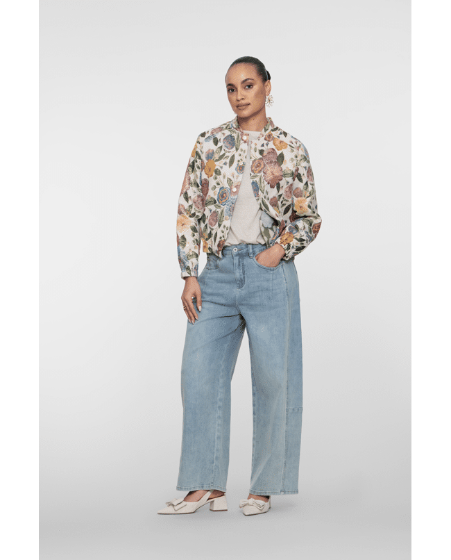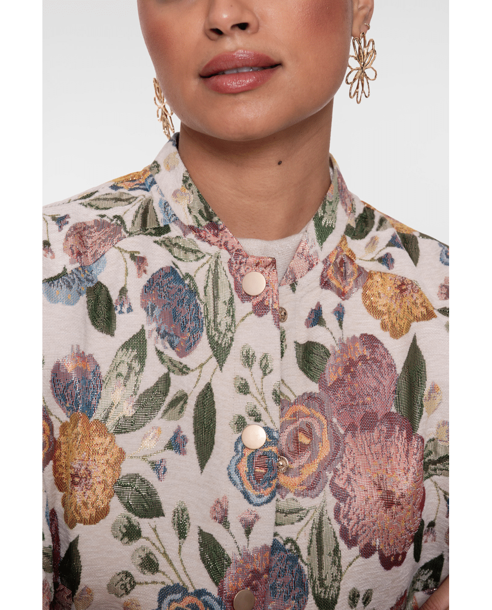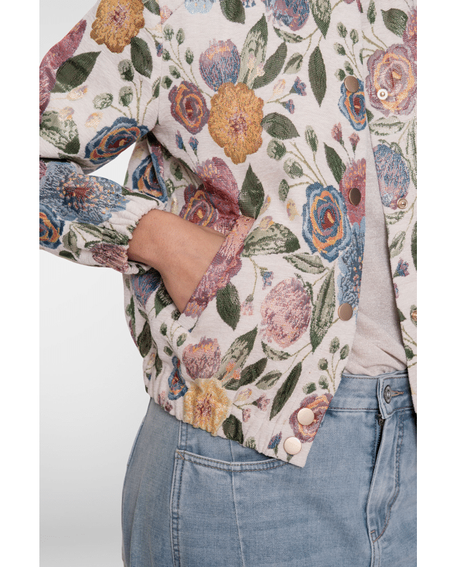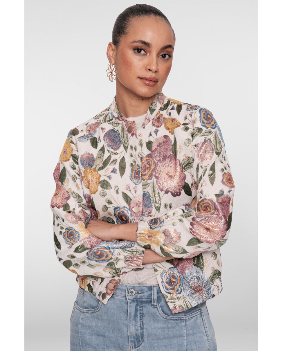 De jacquard bloemenstructuur en zachte glans maken van dit jack een echte eyecatcher – stijlvol én vrolijk.