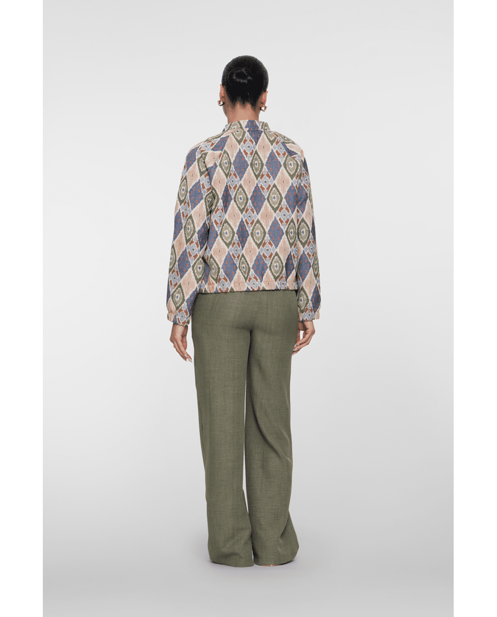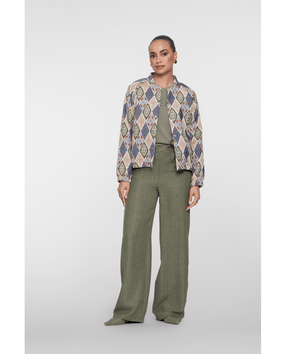 Dit jacquard geweven damesjack van Geisha is een echte eyecatcher met zijn olijfgroene en chambray-blauwe diamantprint. Licht en comfortabel – perfect voor koele zomerdagen of als stijlvolle laag in het voorjaar.