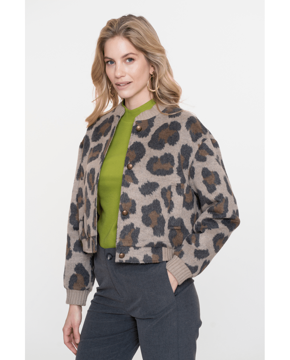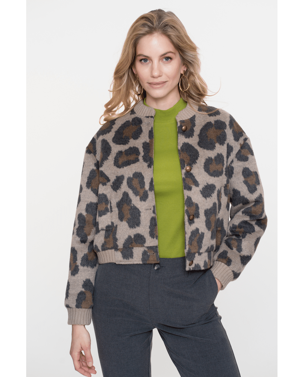 Dames bomber jasje van Geisha met leopardprint, ronde hals, drukknopen en lange mouwen