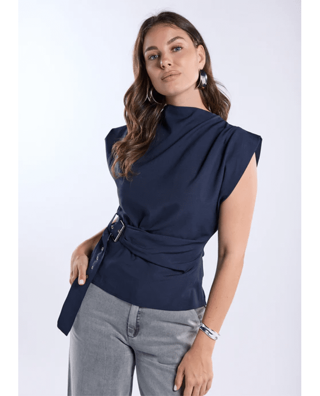 Deze navy dames top met ceintuur is een krachtige mix van elegantie en comfort. De soepele jersey punto stof valt mooi in vorm en accentueert subtiel de taille. Perfect voor een stijlvolle werklook of een avond uit.