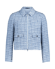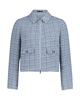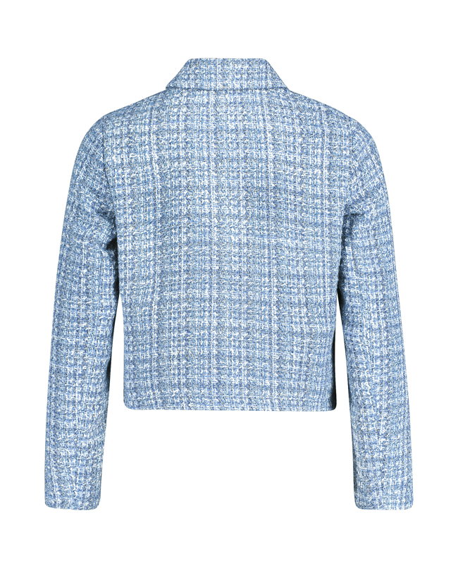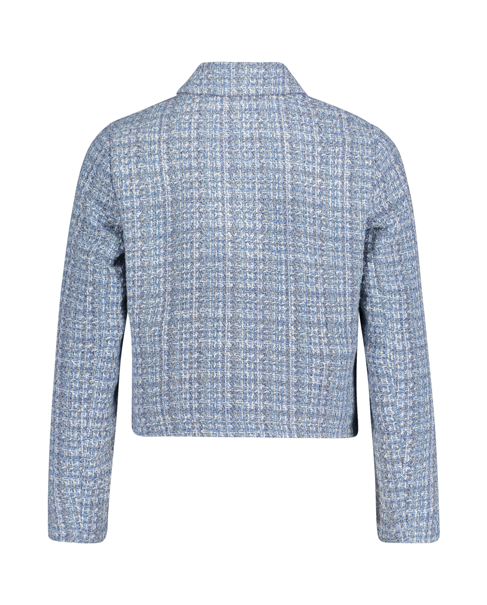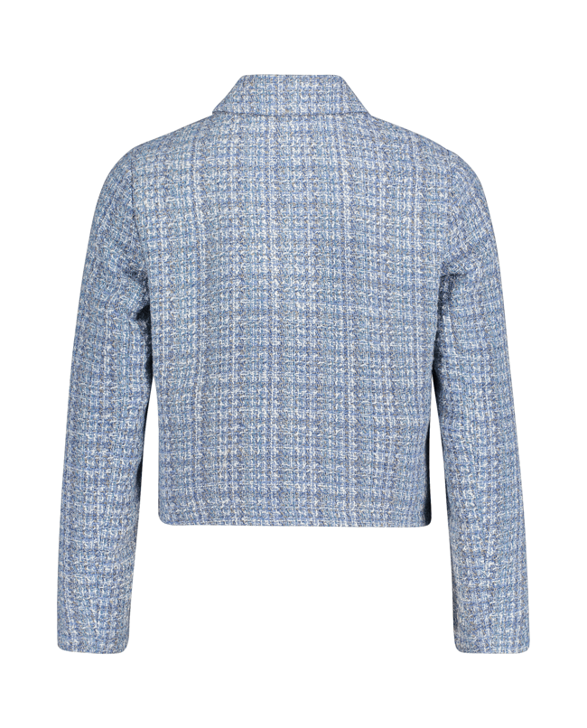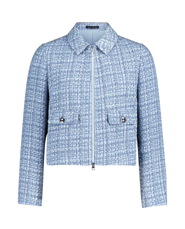 Een kort vallend blazerjasje in zachte bouclé met klassieke overhemdkraag en moderne ritssluiting. Ideaal als stijlvol laagje voor frisse lentedagen.