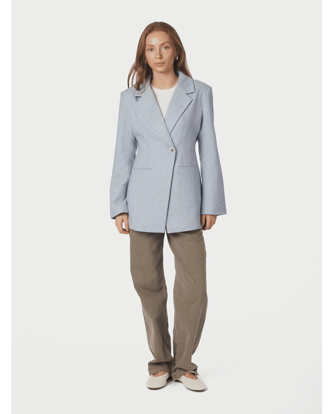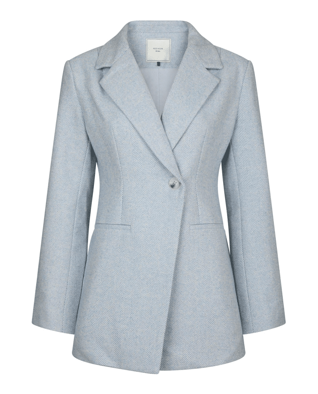 Een elegante dames blazer in lichtblauwe herringbone kwaliteit met een getailleerde pasvorm en subtiele schoudervulling. De Bowie Herringbone blazer van Neo Noir heeft een slanke taille en een schuine sluiting voor een moderne, vrouwelijke look. Mooi als set of los op een jeans voor een stijlvolle voorjaarsoutfit.