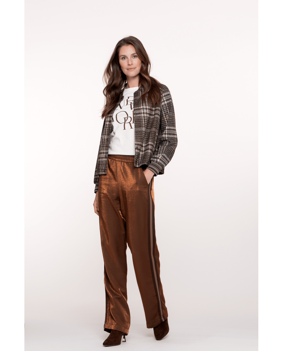 Een glanzende broek met sportieve zijstreep. De vloeiende stof en relaxte pasvorm maken dit een opvallend item voor casual én geklede looks.
