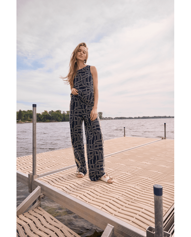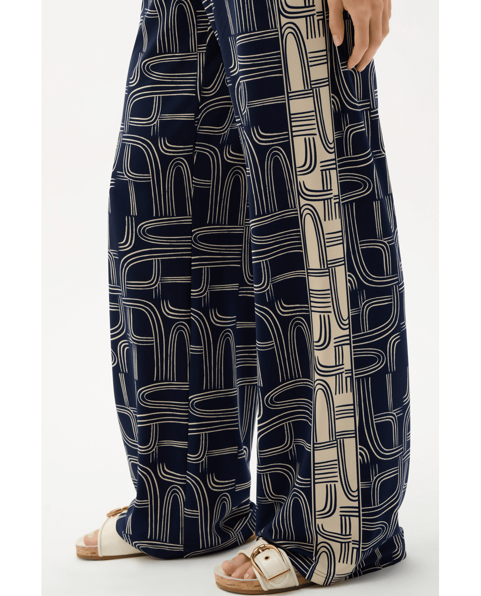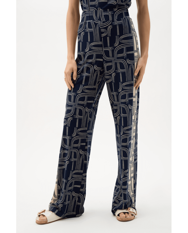 De combinatie van grafisch dessin en vloeiende pasvorm maakt deze broek moeiteloos chic.