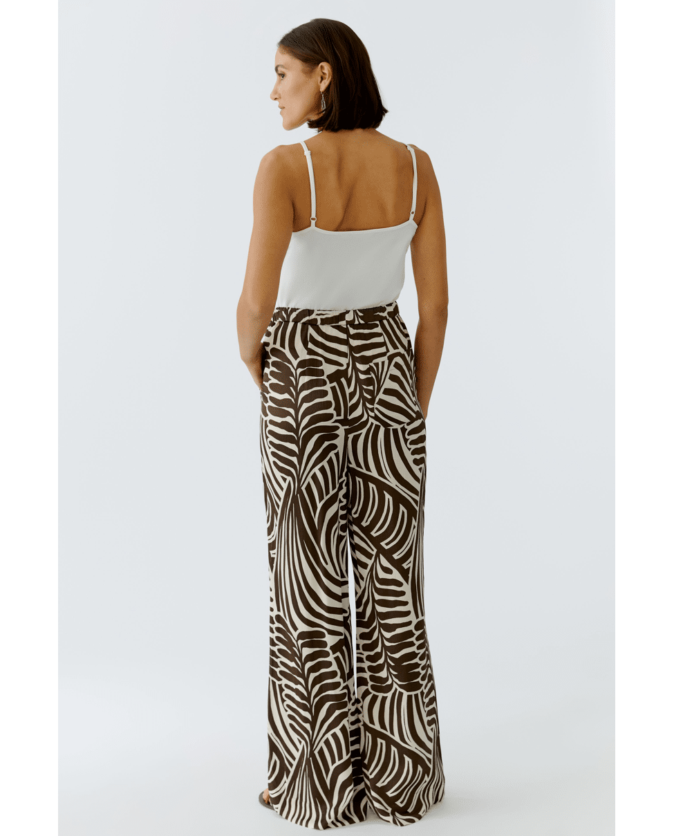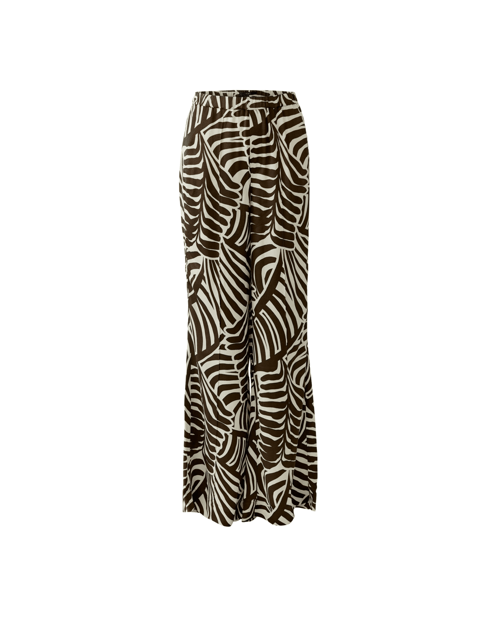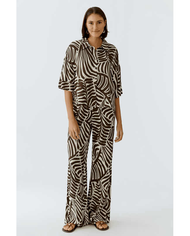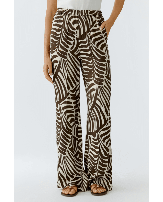 Een luchtige broek met een opvallende grafische print in donkerbruin en off-white. Het expressieve dessin geeft deze broek een moderne en stijlvolle uitstraling.