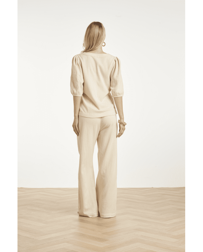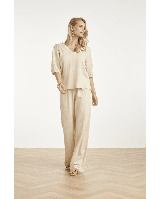 De combinatie van de elegante wijde pijpen en de comfortabele elastische tailleband zorgt voor een moeiteloos chique uitstraling. Een veelzijdige broek die je makkelijk combineert met zowel een blouse als een zomerse top.