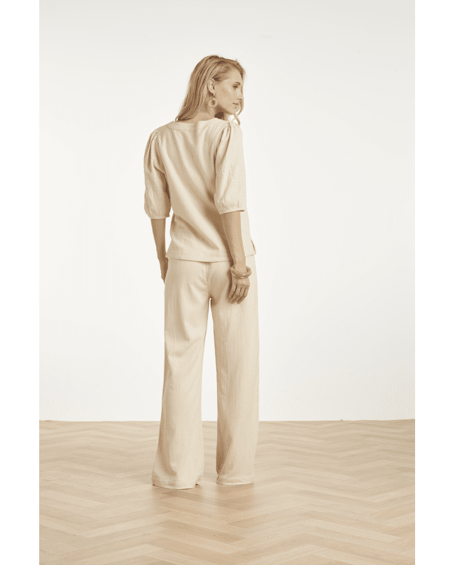 Deze Smashed Lemon wide leg broek met linnen look is een stijlvolle basis voor een luchtige zomeroutfit. De zachte crème beige tint en subtiele structuur geven de broek een natuurlijke, rustige uitstraling. Perfect voor een casual dag in de stad of een ontspannen weekendlook.