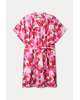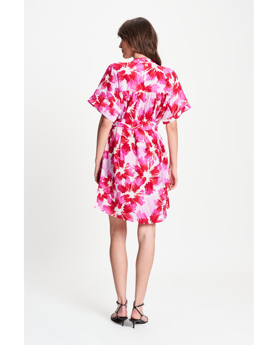 Een zwierige zomerjurk met speelse bloemenprint in roze, rood en lila tinten. Ideaal voor zomerse dagen waarop je stijl én comfort zoekt. Draag los of met ceintuur voor een meer gedefinieerde look.