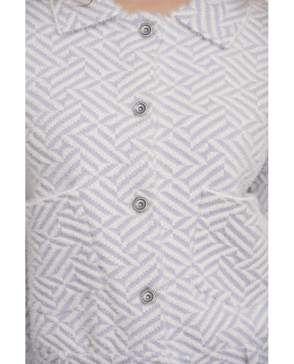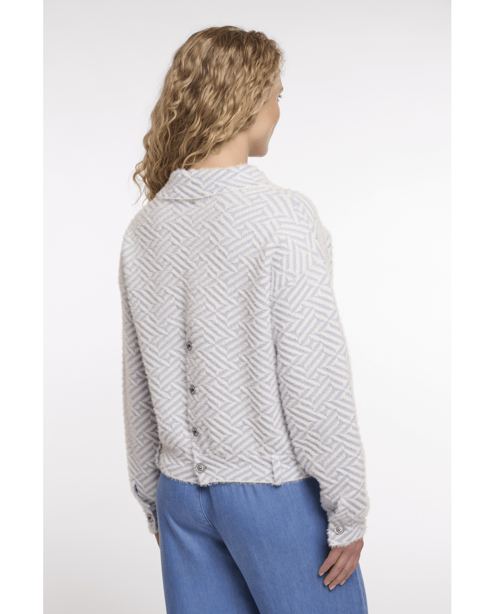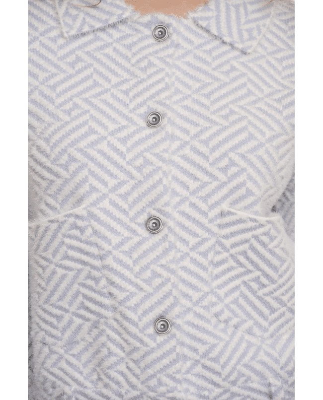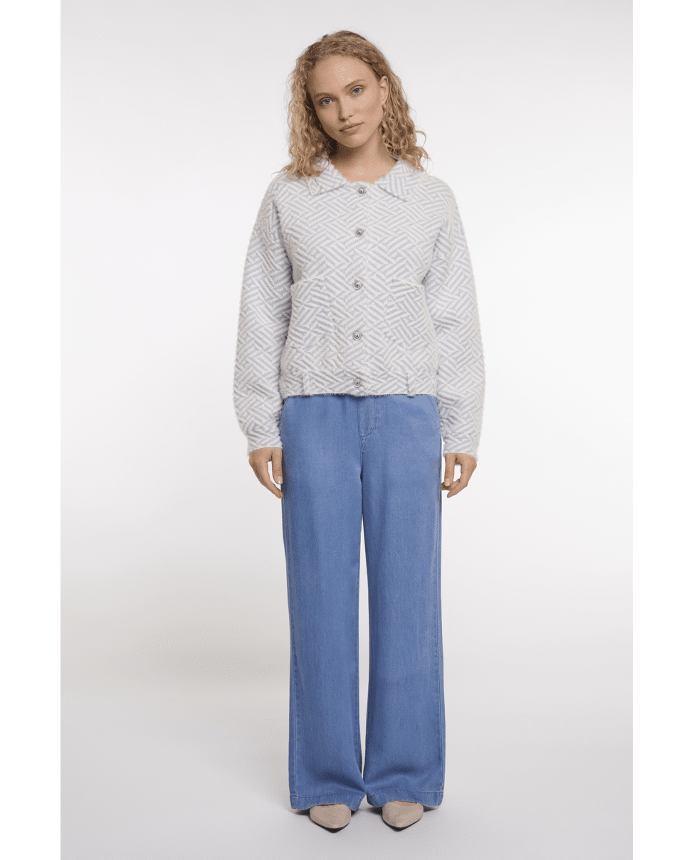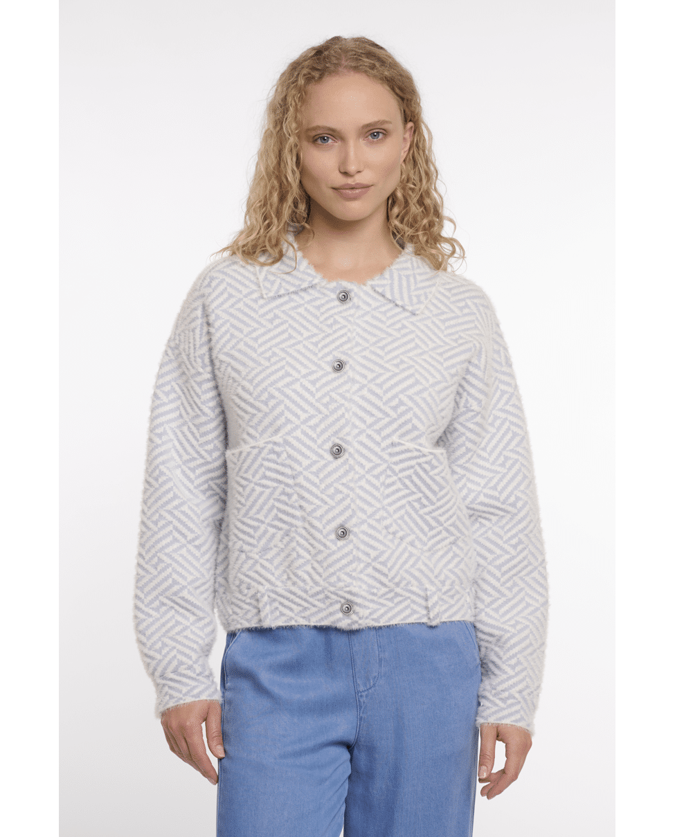 Stoer en stijlvol: dit boxy vest in lichtblauw met grafisch patroon is een opvallend item voor het voorjaar. Ideaal voor frisse dagen waarop je iets extra’s wilt, maar comfortabel wilt blijven.