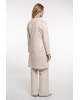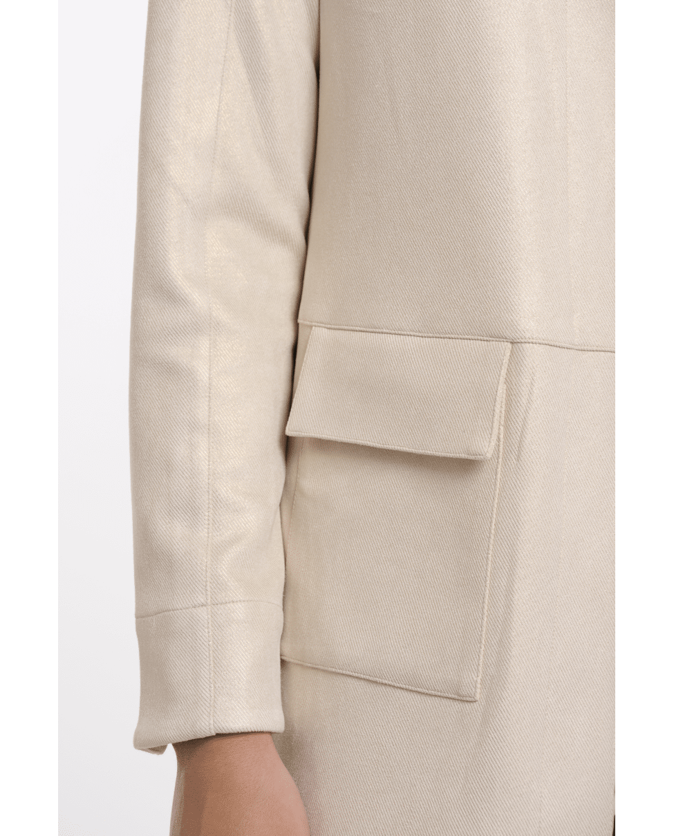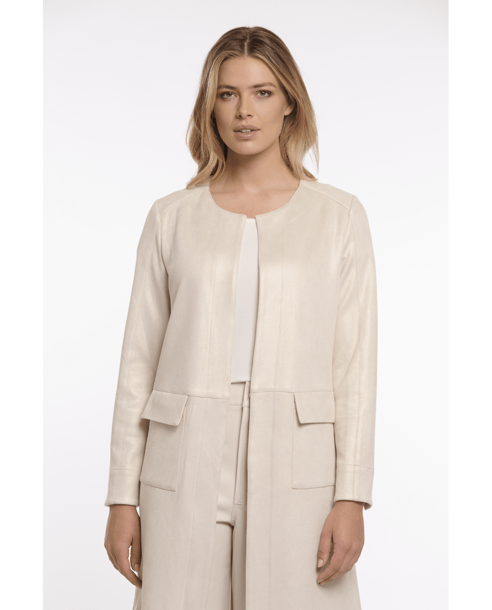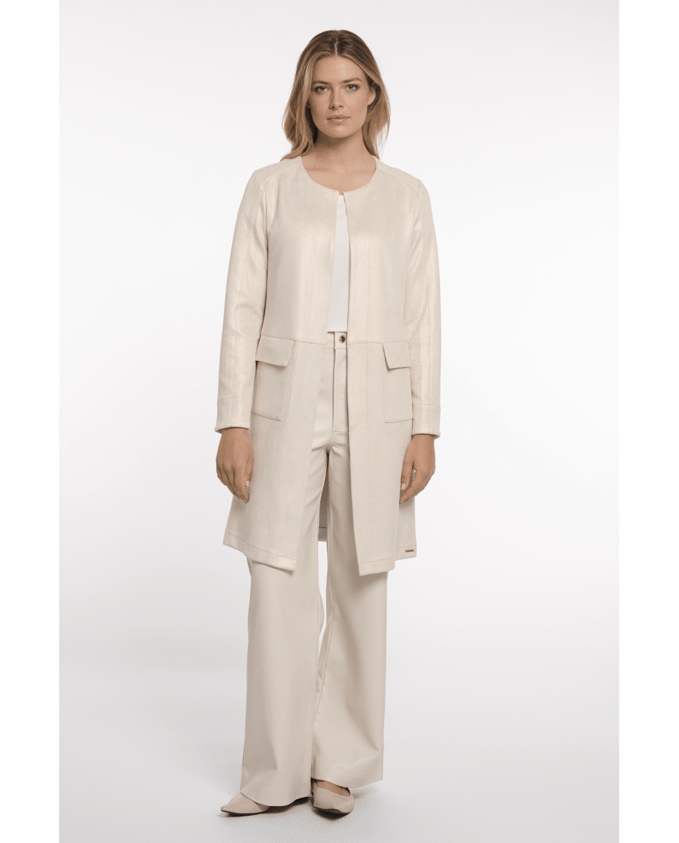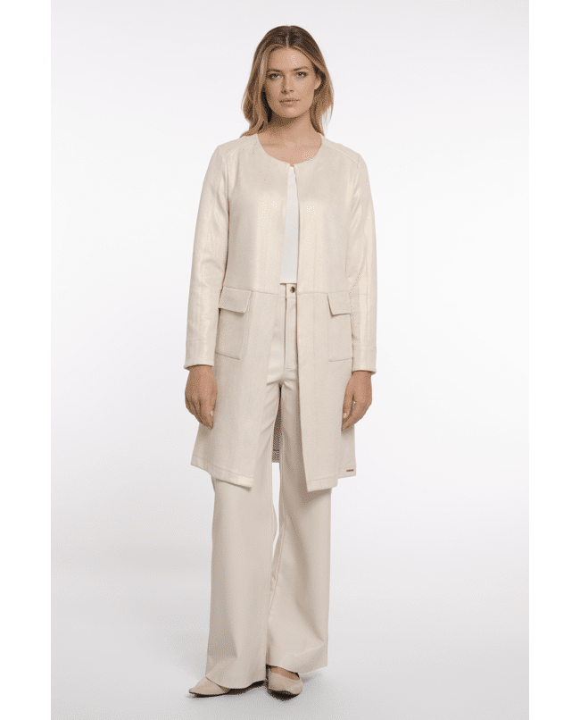 Deze lange jas in ecru met gouden glans is een stijlvolle toevoeging voor frisse lentedagen. Het open model maakt hem perfect voor gelaagde looks – elegant en moeiteloos chic.