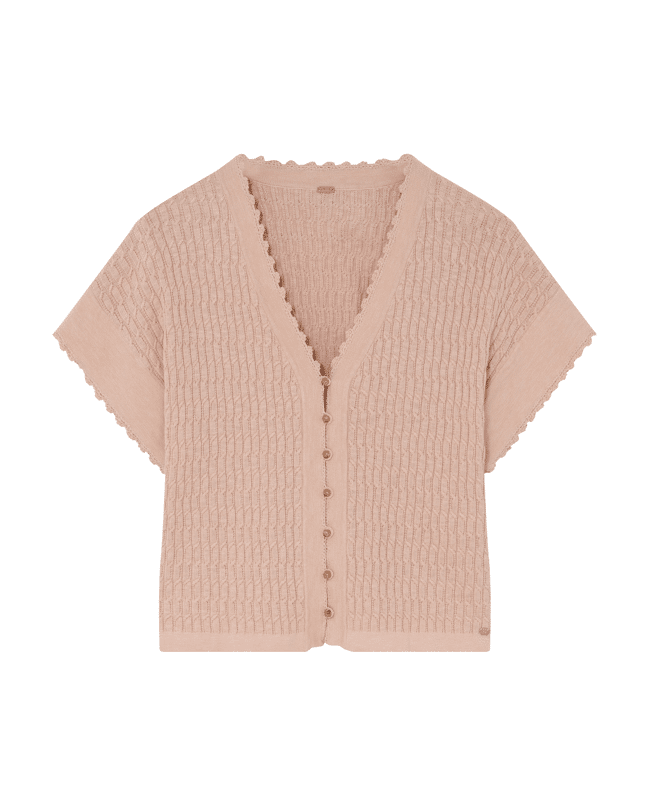 Dit lichtroze knit vest van Gustav is een fijne toevoeging aan je zomergarderobe. Het luchtige breisel en de korte mouwen maken het ideaal voor laagjes op warmere dagen. Draag het open of dicht voor een casual, vrouwelijke look.