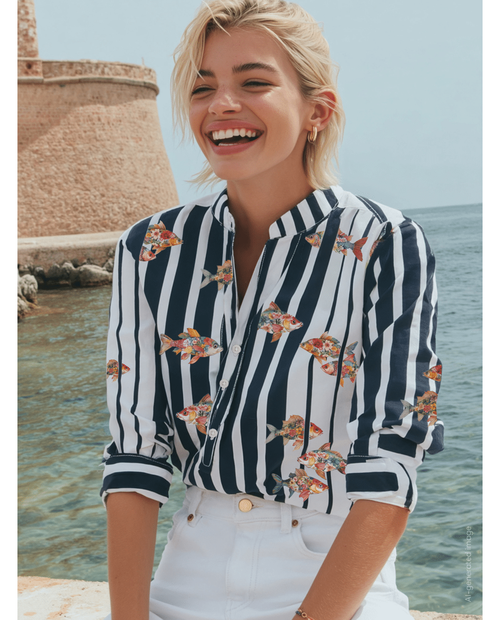 Deze Carlota damesblouse van Vilagallo combineert klassieke marineblauwe strepen met een speelse vissenprint. Een uitgesproken blouse die stijl en vrolijkheid moeiteloos samenbrengt, perfect voor elke dag met een twist.