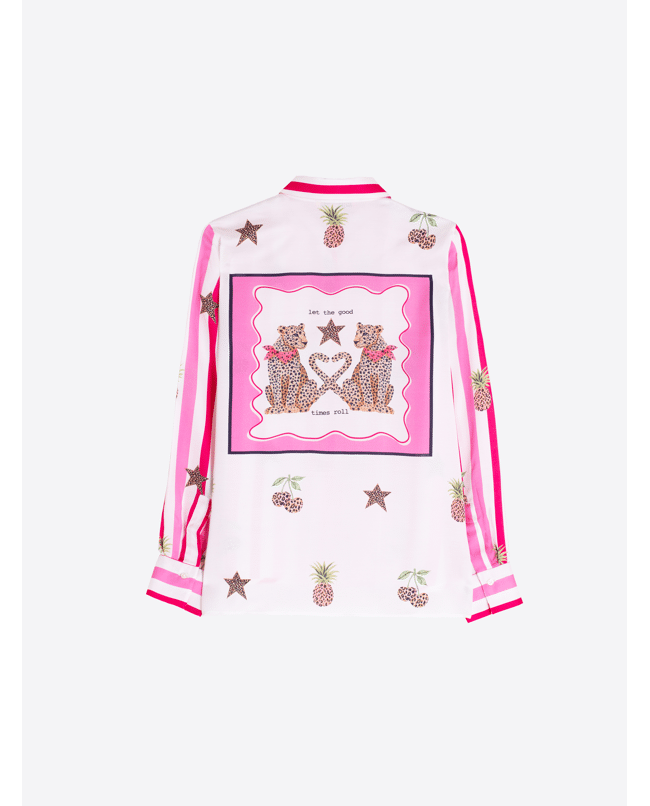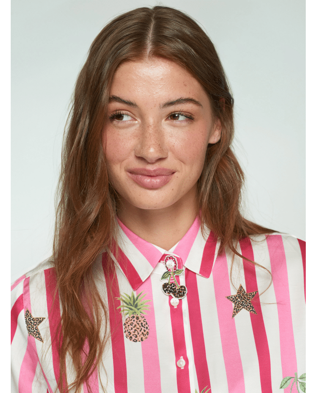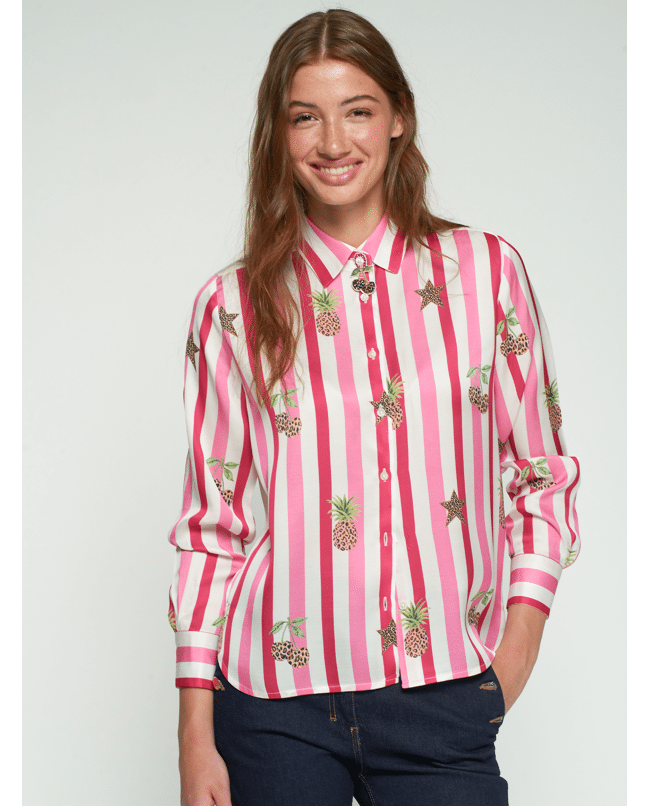 Deze Cherries P blouse van Vilagallo is een uitgesproken mix van strepen en speelse prints. De combinatie van kersen, ananas en sterren in luipaarddessin geeft dit klassieke model een vrolijke en eigenzinnige uitstraling. Perfect voor wie kleur durft te dragen, zonder in te leveren op stijl.